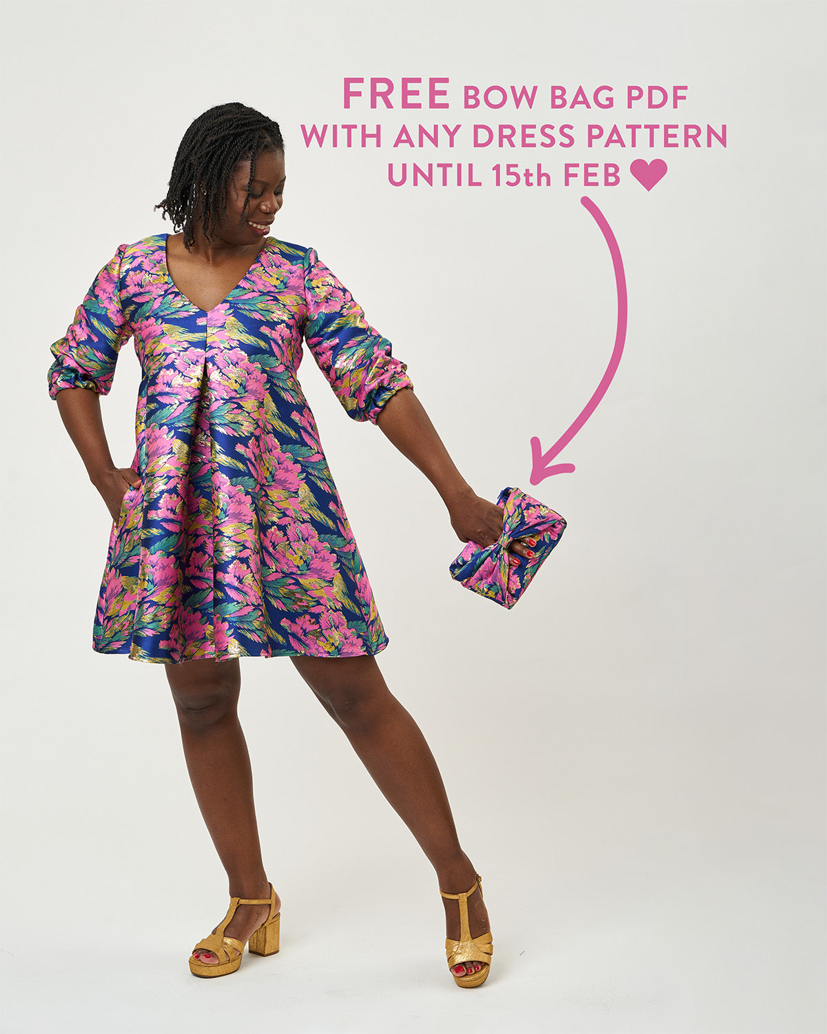 Buy any dress sewing pattern from the selection below and get our cute Bow Bag pattern for free 🎀 Simply add both PDF Patterns to your basket and the discount will apply at checkout!