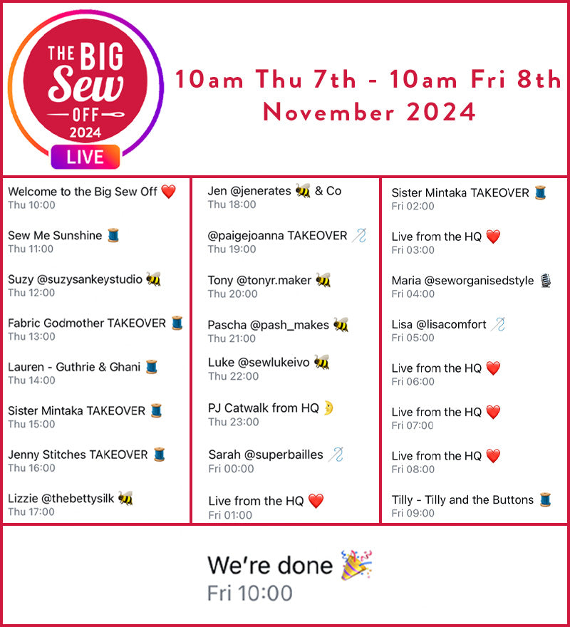 We will be going LIVE on The Big Sew Off Instagram account every hour on the hour throughout the 24 hours of our sewathon, so make sure you're following @thebigsewoff. There will be Lives from the HQ, sewing chats with lots of familiar faces, and some exciting Takeovers!