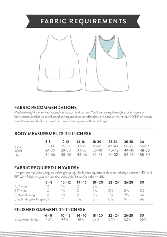 Make a heavy duty Apron in cotton twill/drill, canvas or denim, finished with twill tape on the inside. For a lighter version, use two different cotton fabrics and make a lined Apron finishing the edges with binding. We’ve included instructions for both styles, so you can make an Apron to suit your hobby and style.