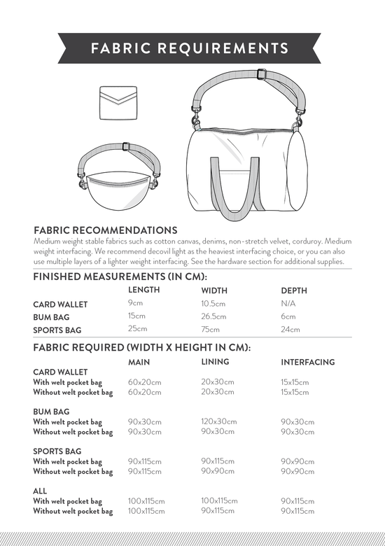 Make a bespoke set in matching or complementing fabrics, or put your scraps to good use. The Card Wallet and Bum Bag use very little fabric, and you only need a metre of lining, outer and interfacing to make all three patterns!