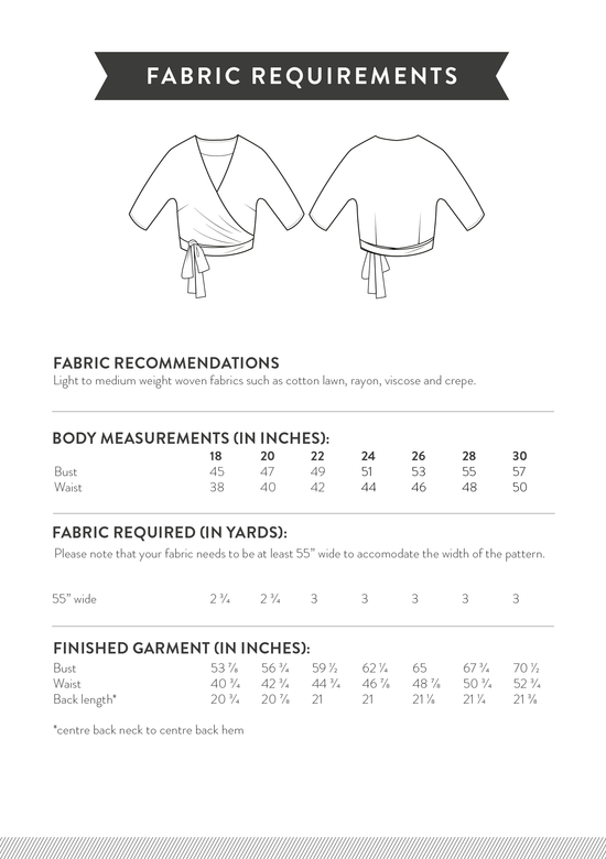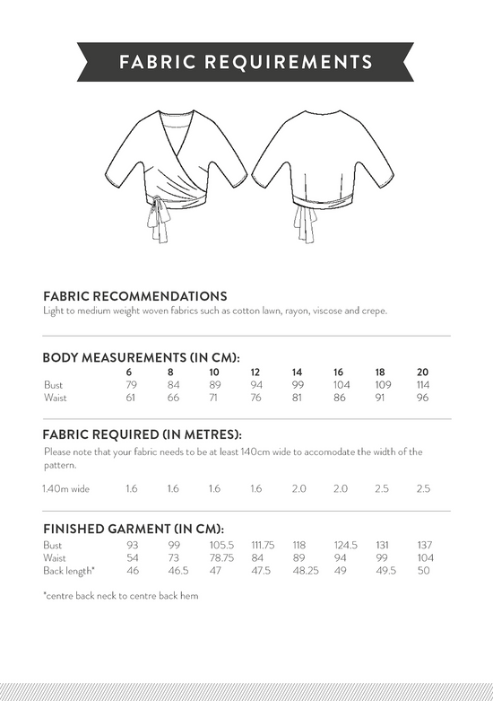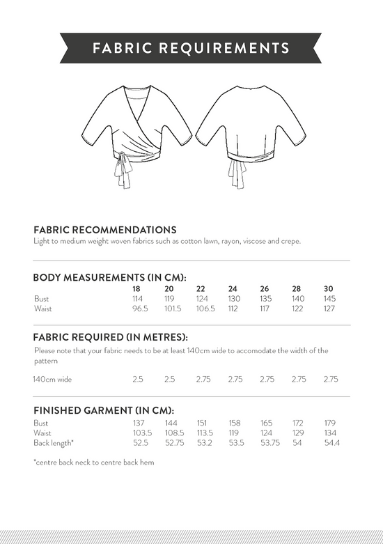 Make your Ella in a plain fabric for a classic wrap top you can wear with anything, or pick a beautiful print for a wow moment! We recommend using a light woven fabric with drape such as viscose or crepe, and you could also use a light cotton lawn.