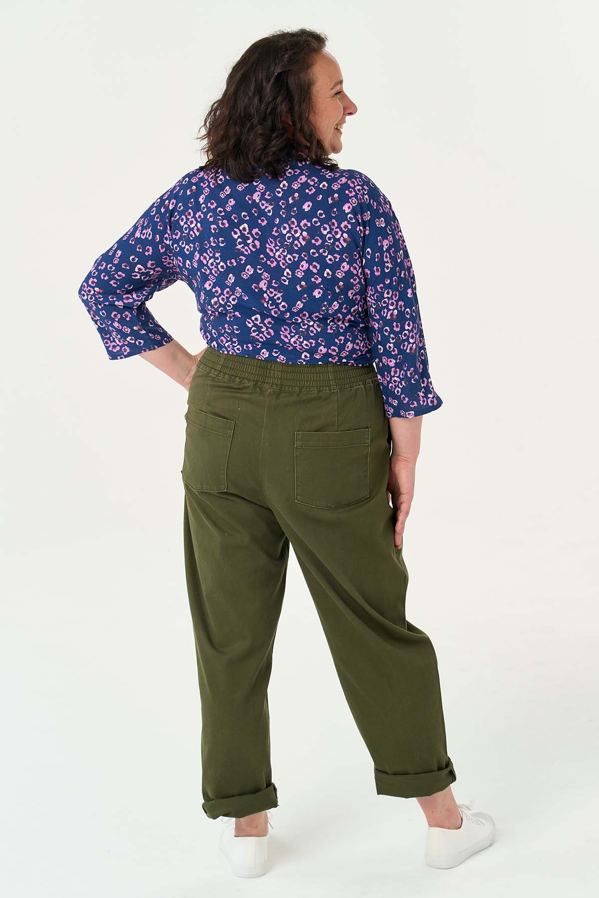The Ella Blouse is a pretty waist-length top that wraps across the front and secures in place with ties. The two front edges gently pleat into the tie at the waist for a beautiful detail, and the 3/4 length grown-on sleeves are nice and easy to sew. On the inside, the blouse is neatly finished with facings. This pattern is the perfect project for beginner, intermediate and advanced sewists alike – a versatile wardrobe piece that is both simple and interesting to sew.