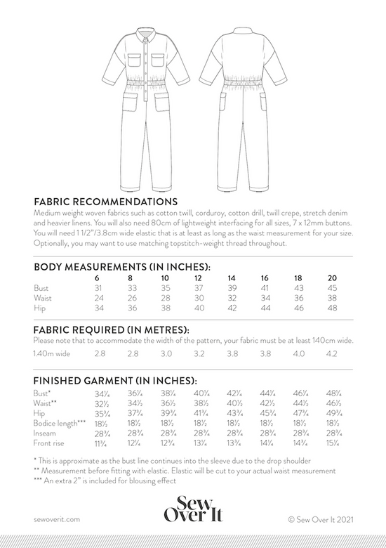 Farrah features a button-up front, collar and collar stand, patch pockets with pocket flaps, drop-shoulder sleeves, tapered legs and an elasticated waist. Designed to be loose-fitting in the bodice for a modern, oversized feel, it’s cinched in at the waist with a closer fit on the hips.