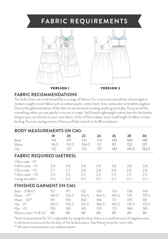 The bodice is lined and gathered at the centre front to create a gentle sweetheart shape over a wide waistband. Version one closes with a beautiful bow at the back (fully bra-friendly when tied the right way). Version two closes with buttons at the centre back and includes two different options to create a higher or lower back cut-out.