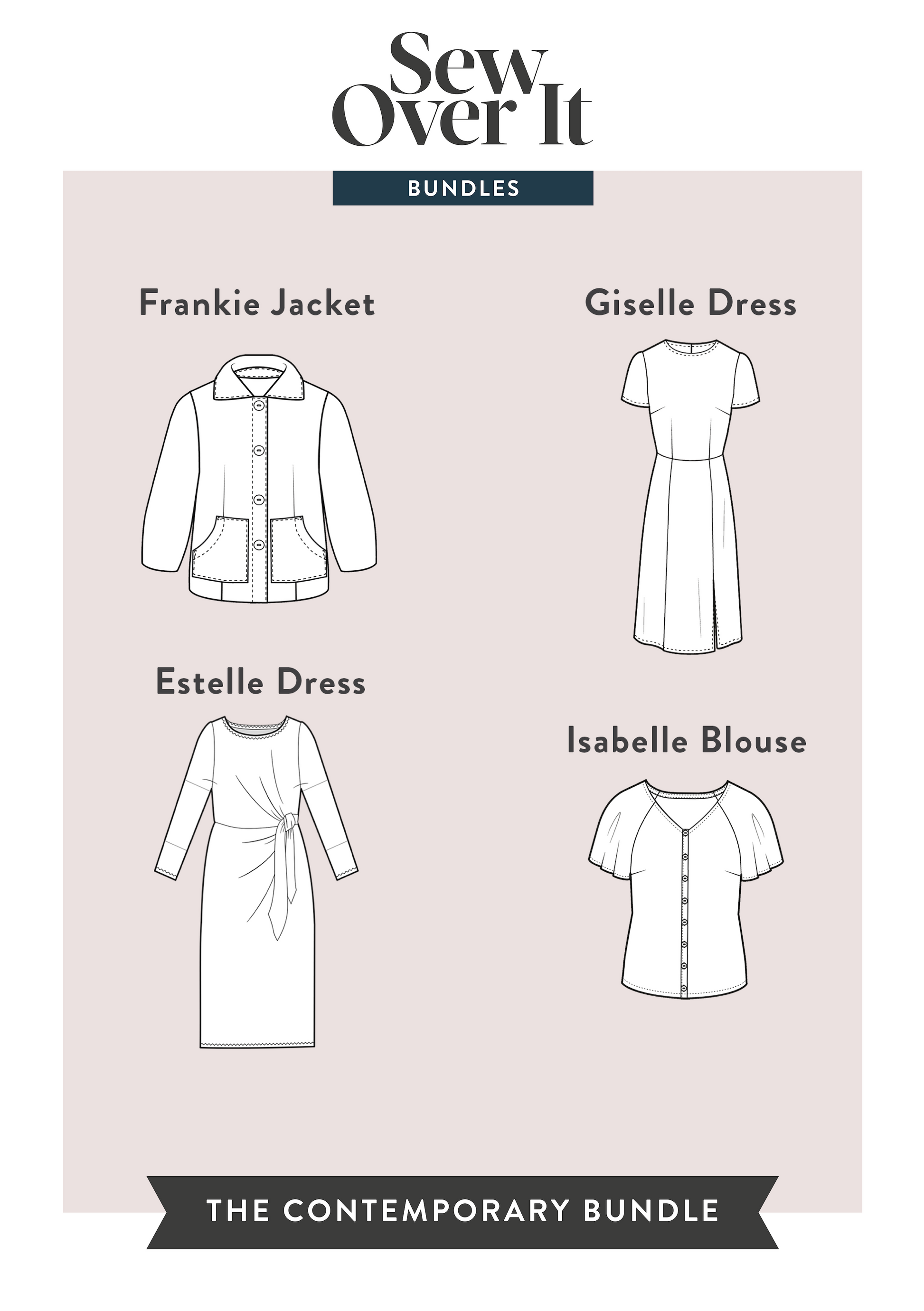 The collection includes the PDF patterns for the Estelle Dress, Giselle Dress, Isabelle Blouse & Dress & Frankie Jacket.