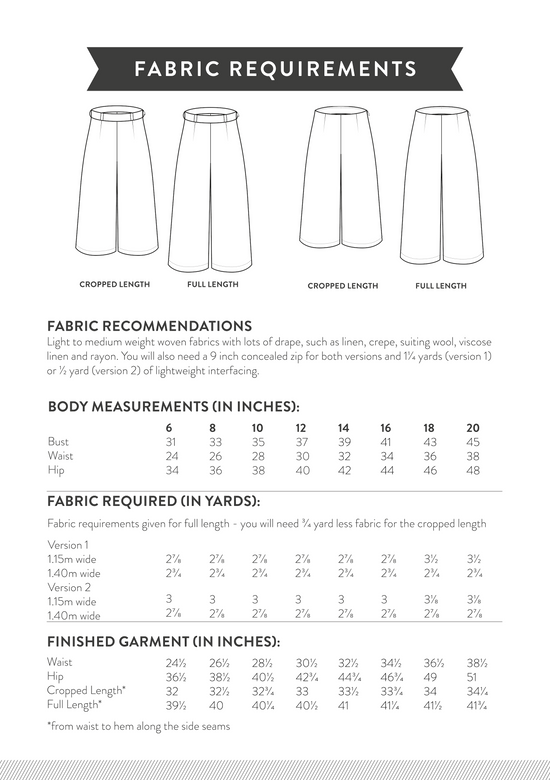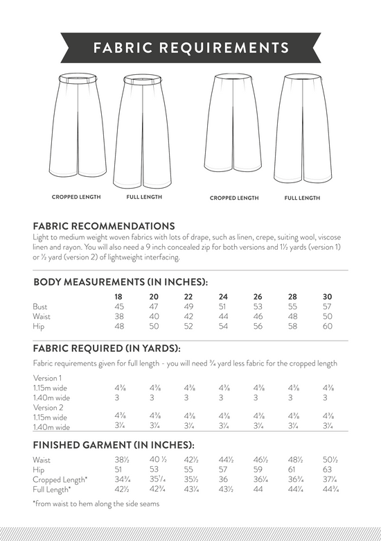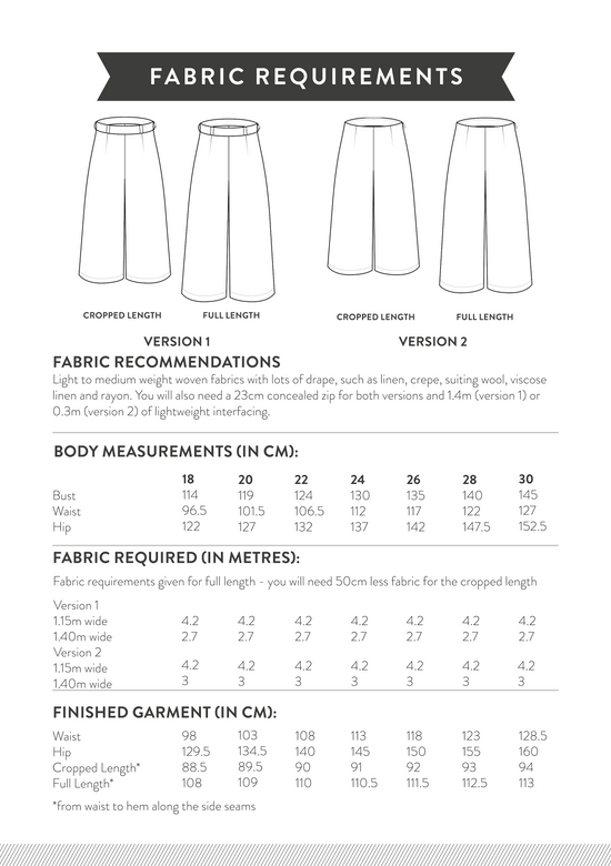 The Hazel Trousers are the new and improved version of our Ultimate Culottes sewing pattern. We have extended the sizing to our full UK 6-30 range and we've added a gorgeous full length version alongside the original cropped version.