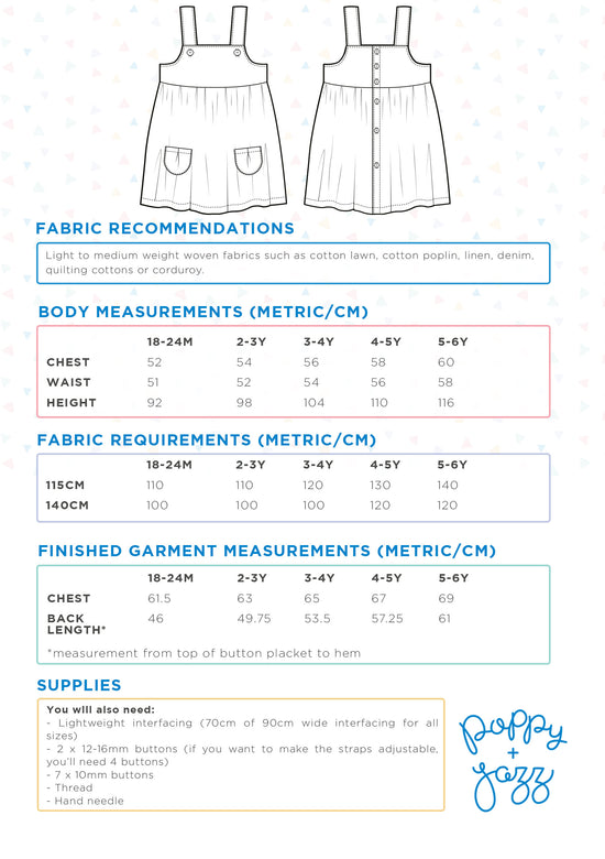 Willow is a classic little pinafore. Featuring a bib with adjustable straps and a gathered skirt, it has additional details such as sweet pleated pockets and a button-down back. It can be made up in a range of fabrics, from quilting cottons to corduroys and denims, making it ideal for year-round wear.