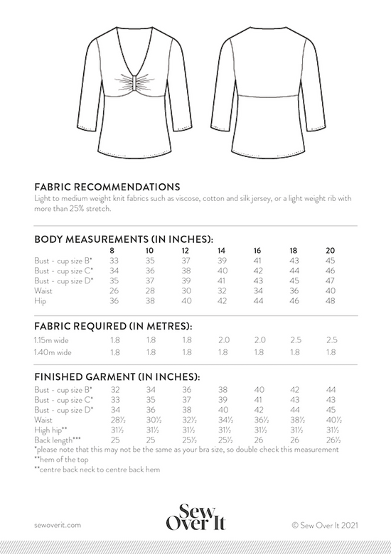 The Alice Top is a v-neck top with a pretty bow-effect bust detail, designed to be sewn in lightweight knit fabrics. Alice comes with individually graded cup sizes (B, C and D) to ensure the best fit. The depth of the bust panels can be adjusted to suit you too – if you want a less revealing v-neck simply gather the bust panels a little less at the centre front, and adjust the length of your tab to match. Alice also features 3/4-length sleeves and a fully-lined bust for a beautiful finish on the inside and minimal topstitching.