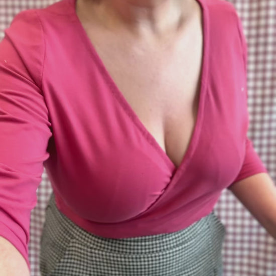 Astrid is designed for knit fabrics and features a faux wrap neckline that is drafted snug to avoid any gaping. Pick between short, ¾ length or full length sleeves and make Astrid as a hip-length top or a full bodysuit. This version includes a lined gusset with popper fastenings and elastic around the legs for a close fit. The neckline is finished with binding on both versions. Pair your Astrid with the Rosemary Trousers for a stylish everyday look.