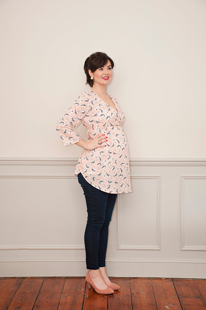 The Blossom Top and Dress maternity sewing pattern creates a flattering v-neck wrap-style blouse with a nipped-in under-bust, elegant 3/4 length sleeves and shaped hem.