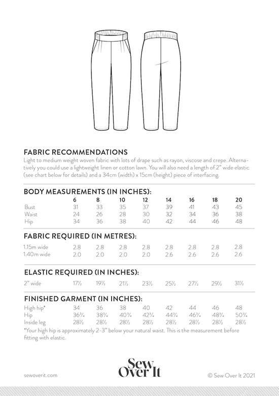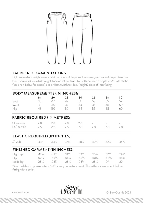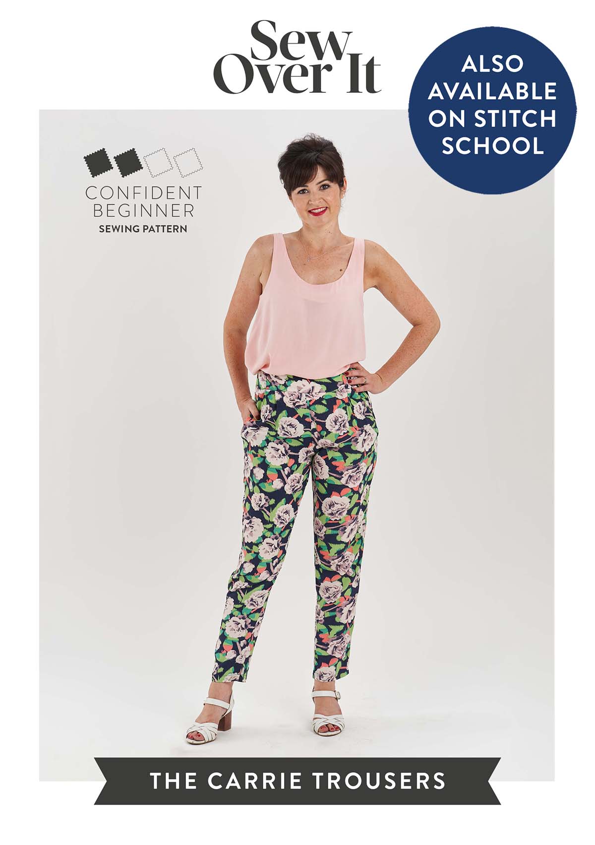 The Carrie Trousers are loose-fitting through the leg, slightly tapering towards the ankle. With no tricky closures, they have a flat-fronted, elasticated-back waistband with pretty pleats at the front. Practical and ideal for spring and summer, the Carrie Trousers are mid-rise and feature ever-useful slanted pockets. Easy to fit, they are a great starting point for newbie trouser sewers who want to get to grips with construction.