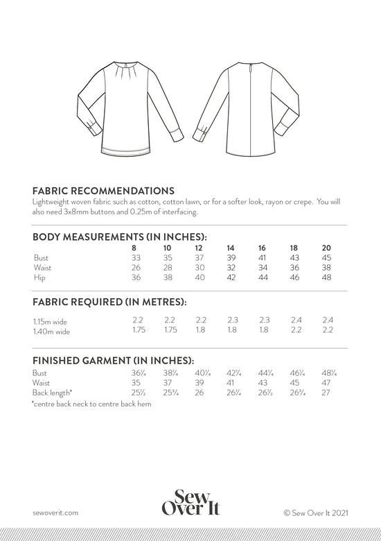 The Clara Blouse features a pretty pleated round neckline, keyhole opening at the centre back, a stepped hem, and long sleeves with deep cuffs and continuous-bound placket cuff closures. Easy to wear tucked in or loose to suit your style, the Clara blouse has a relaxed cut with gentle curving at the side seams. With a dartless bodice, shaping at the bust is provided by the neckline pleats for a gentle, figure-skimming feel.