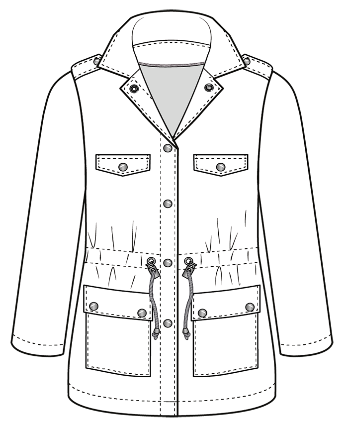Shaping is given by an adjustable drawstring waist and the the hem is hip-length.
