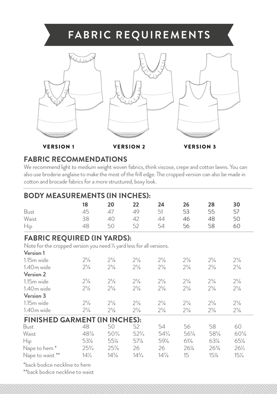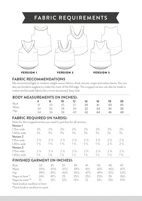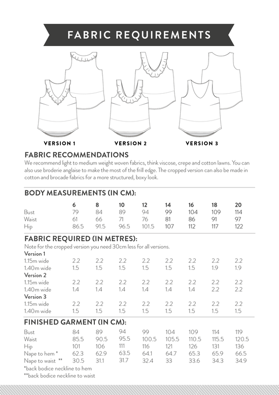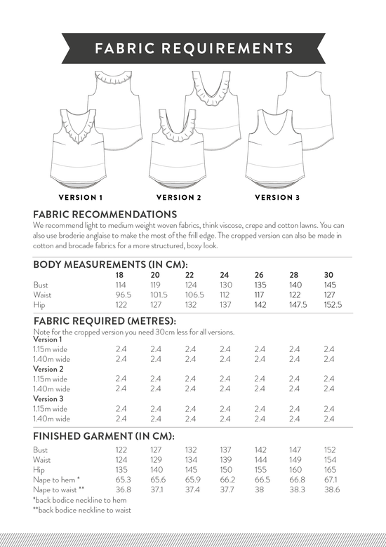 All versions work well in a drapey fabric like viscose or viscose linen, and the cropped version also looks great in cotton or linen. The frill is cut on the straight grain, so it’s a great opportunity to play with border prints or the scalloped edge of a broderie anglaise.