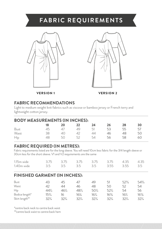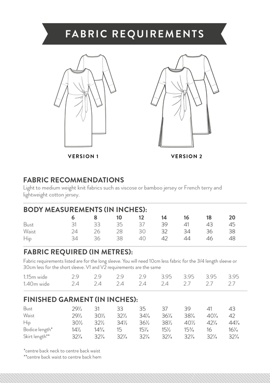 This is a dress that can look casual, sophisticated or sassy, depending on the fabric you use. Make your Estelle in a viscose or bamboo jersey for a slinky version that hugs the body, or pick a light cotton jersey for an everyday dress that can be elevated with just a change of footwear. Try her in a sparkly jersey or a stretch velvet to make a stunning party dress for the festive season or a winter wedding!