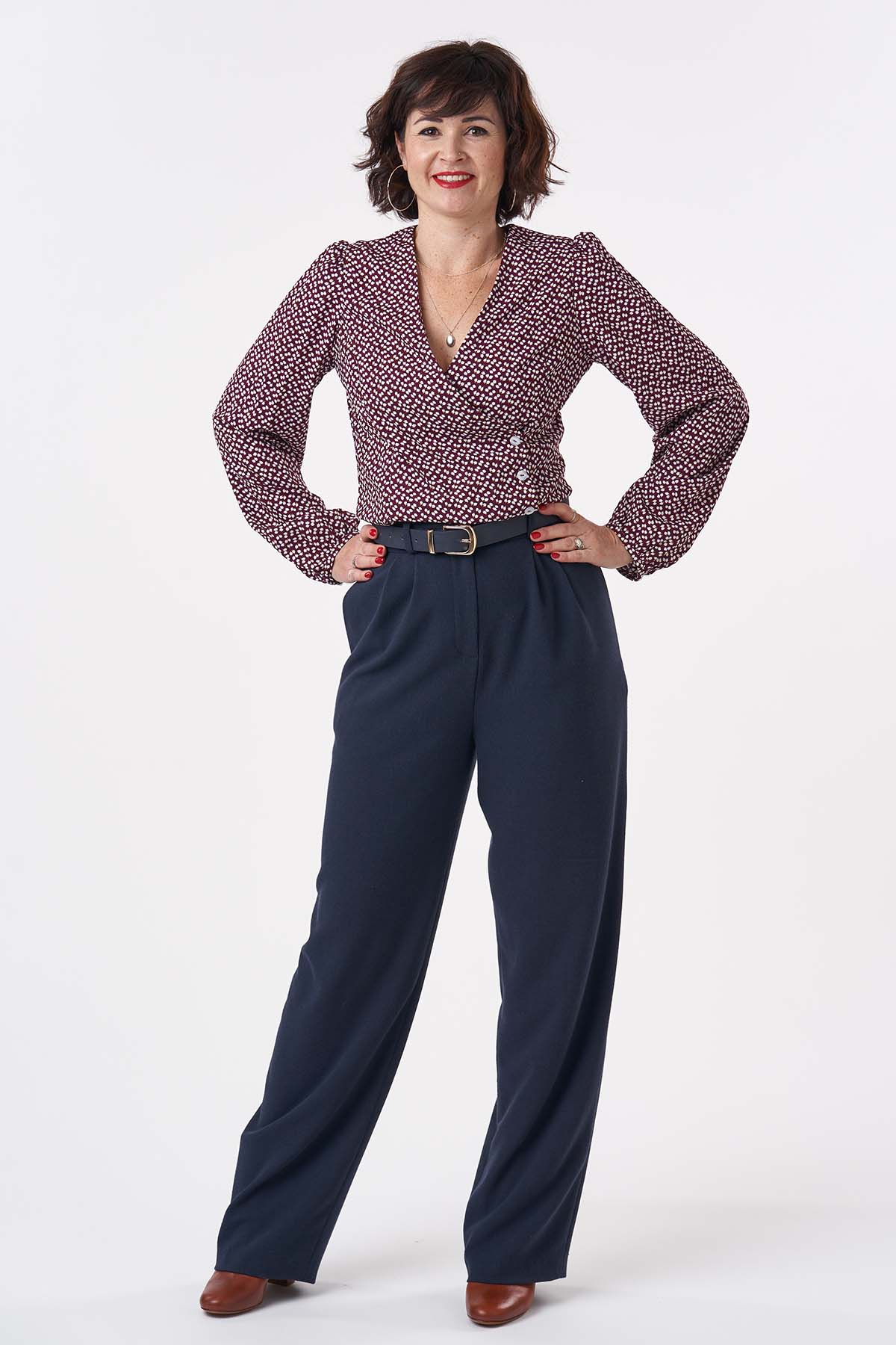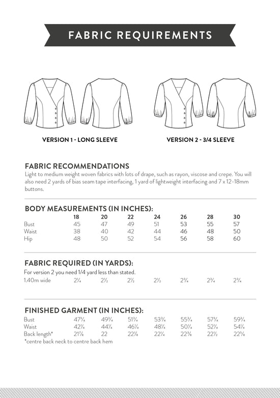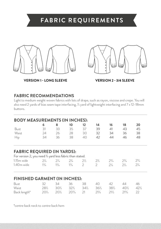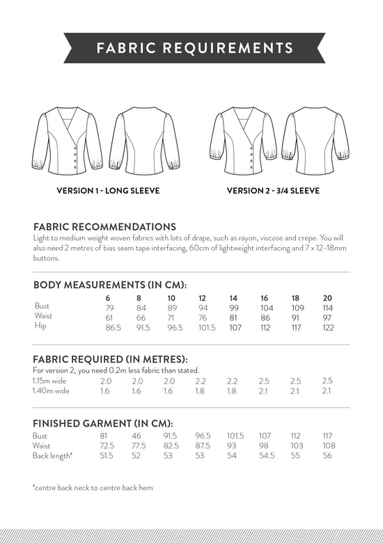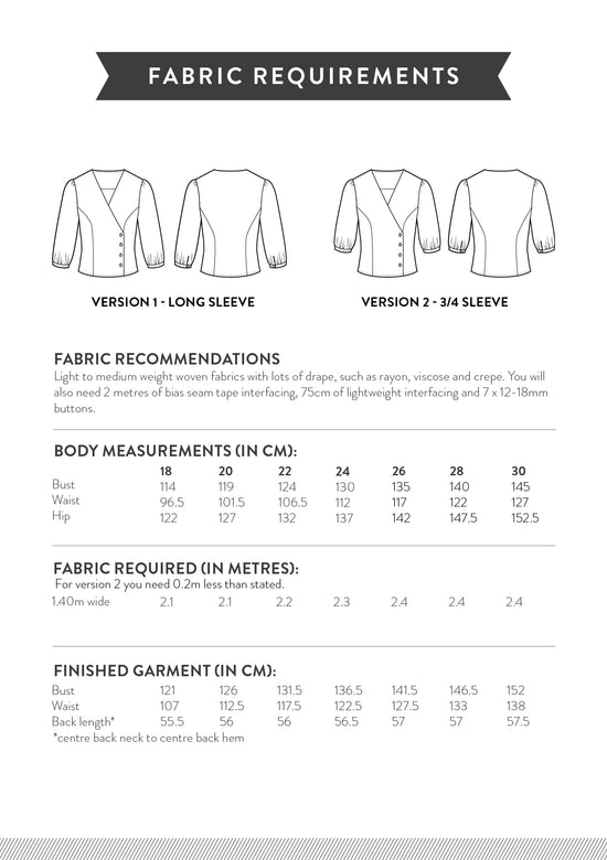 The Esther Blouse is a gorgeous wrap blouse featuring princess seams, asymmetrical buttons and subtle puff shoulders. The statement sleeves are finished with a neatly bound cuff opening and a narrow button-up cuff.