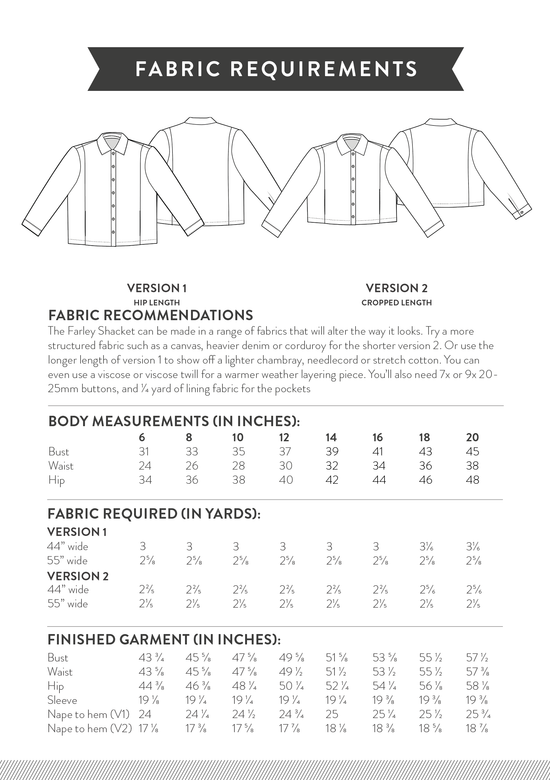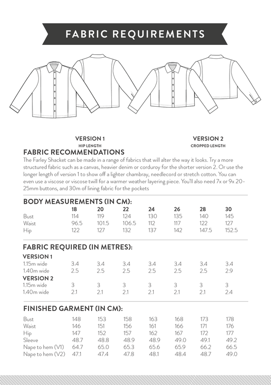 Version one is hip-length and will work in most woven fabrics, from a classic shirting to needlecord and flannel, as well as heavier fabrics. Version two is cropped and will work best in a more structured denim or canvas to hold its shape.