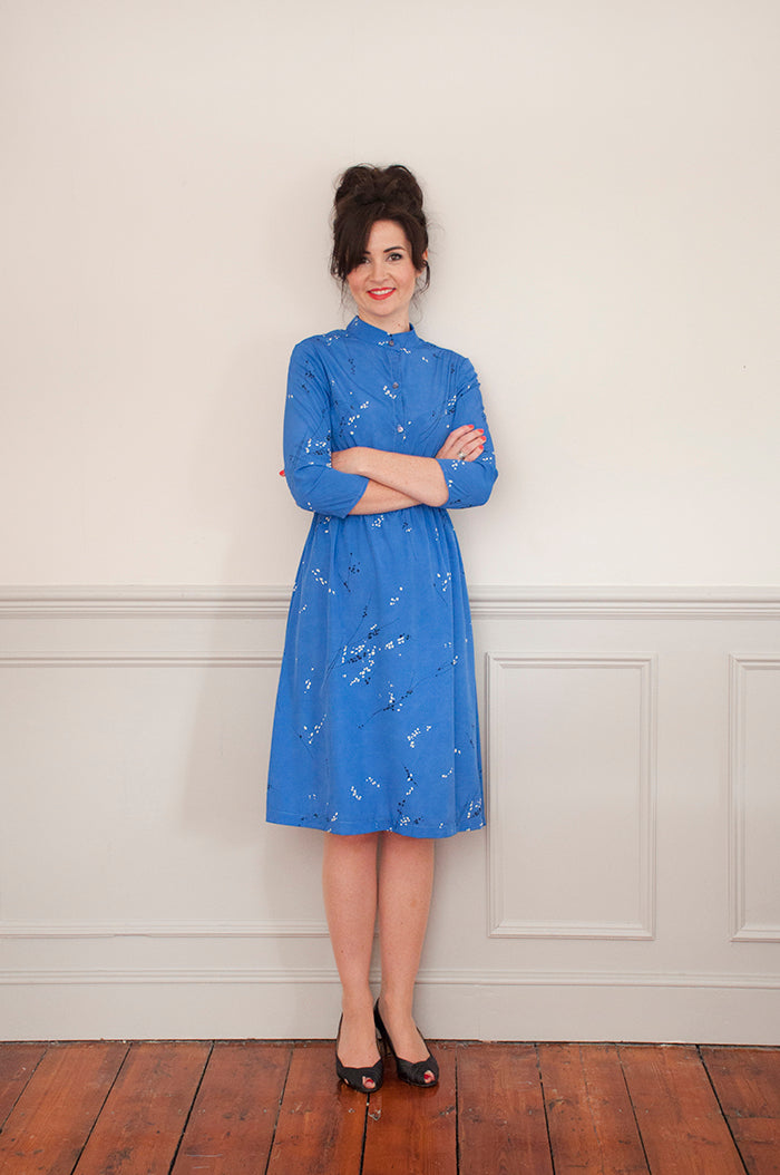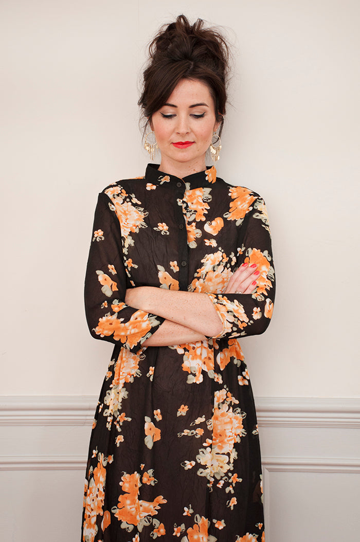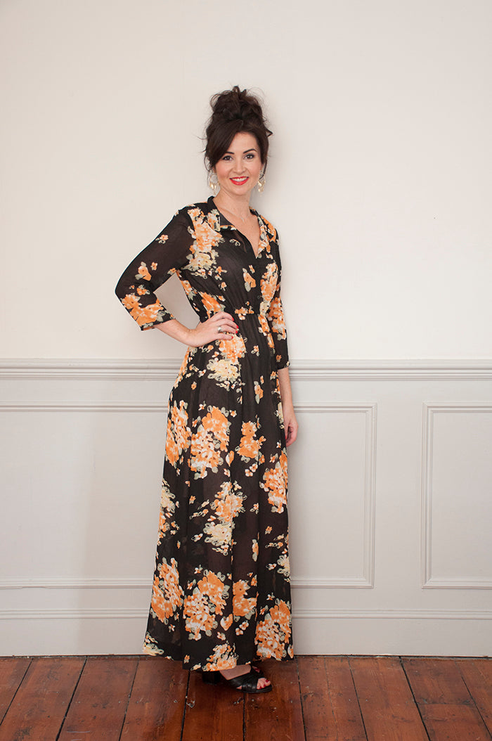 The pattern features a button-up bodice with a pretty mandarin collar, 3/4 length set-in sleeves, and an easy-fit elasticated waist. Pick between two lengths for the A-line skirt: knee-length or maxi for an effortless swishy dress.
