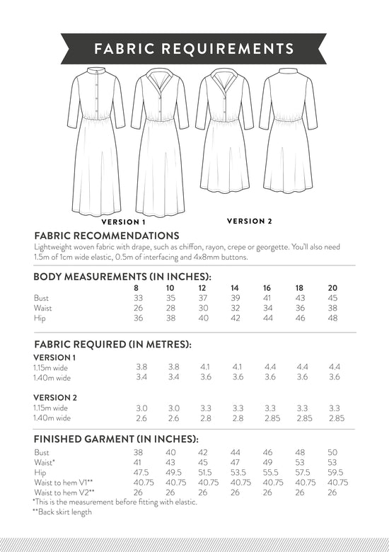 The Florence Dress PDF sewing pattern is availabel in UK sizes 8-20. See the size chart below for details on fabric requirements.