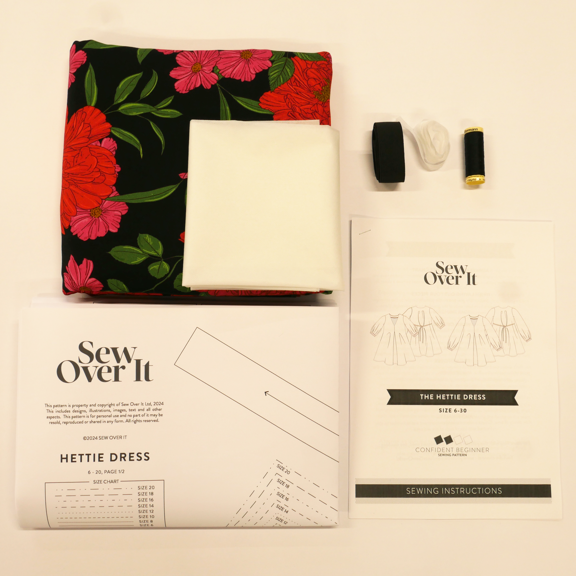 The kit includes the pattern, instructions, fabric and supplies to sew up a beautiful Hettie Dress, PLUS the PDF pattern so you can make Hettie again and again.