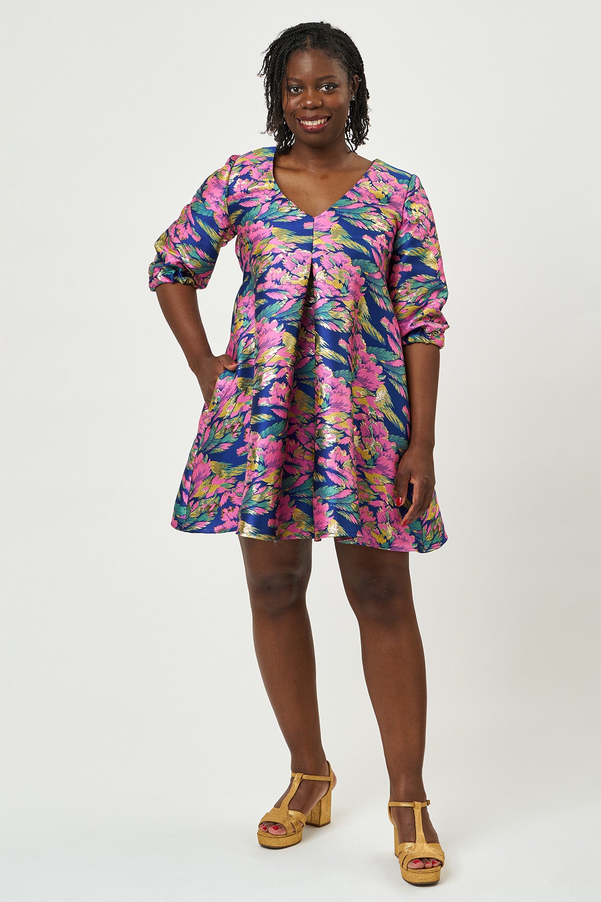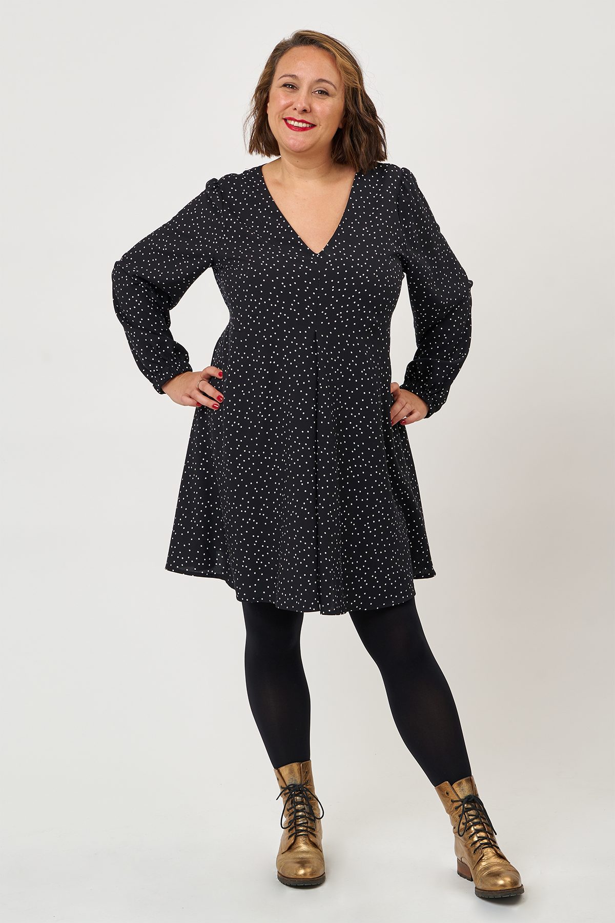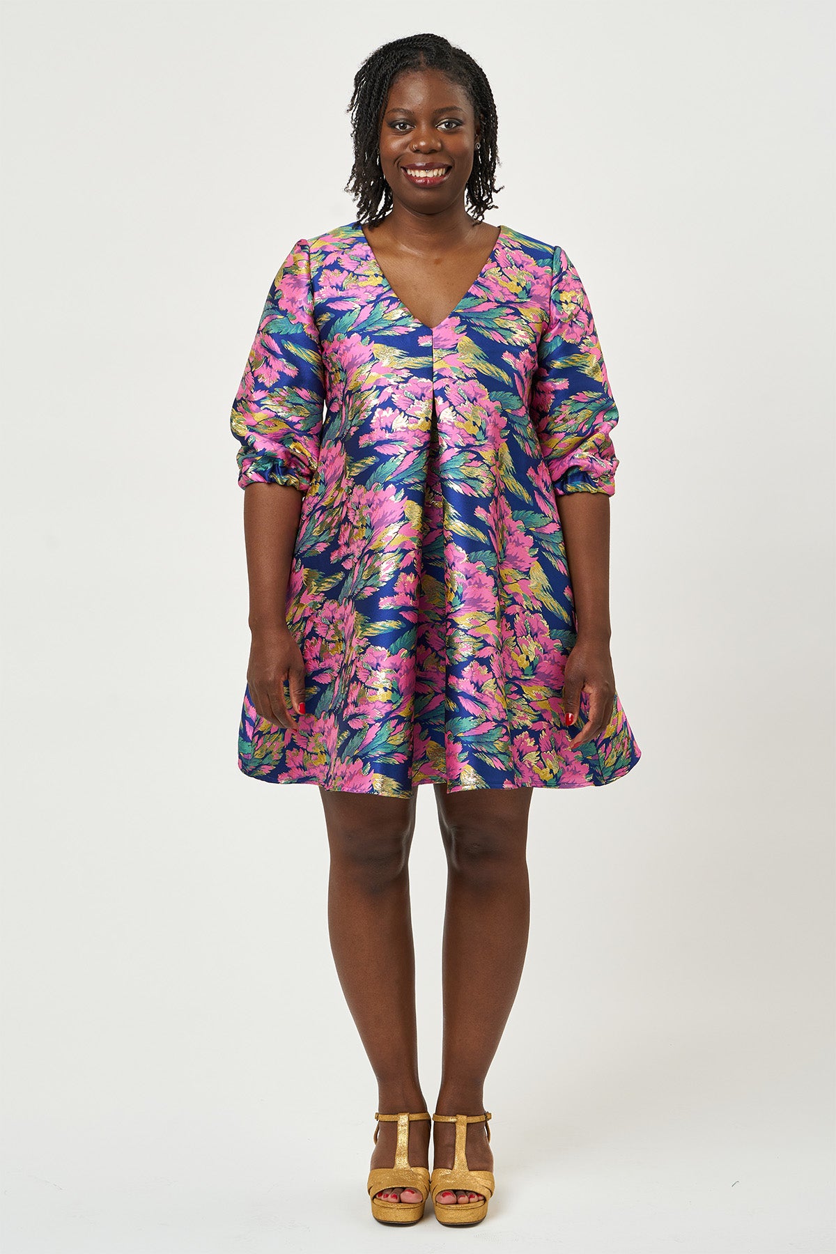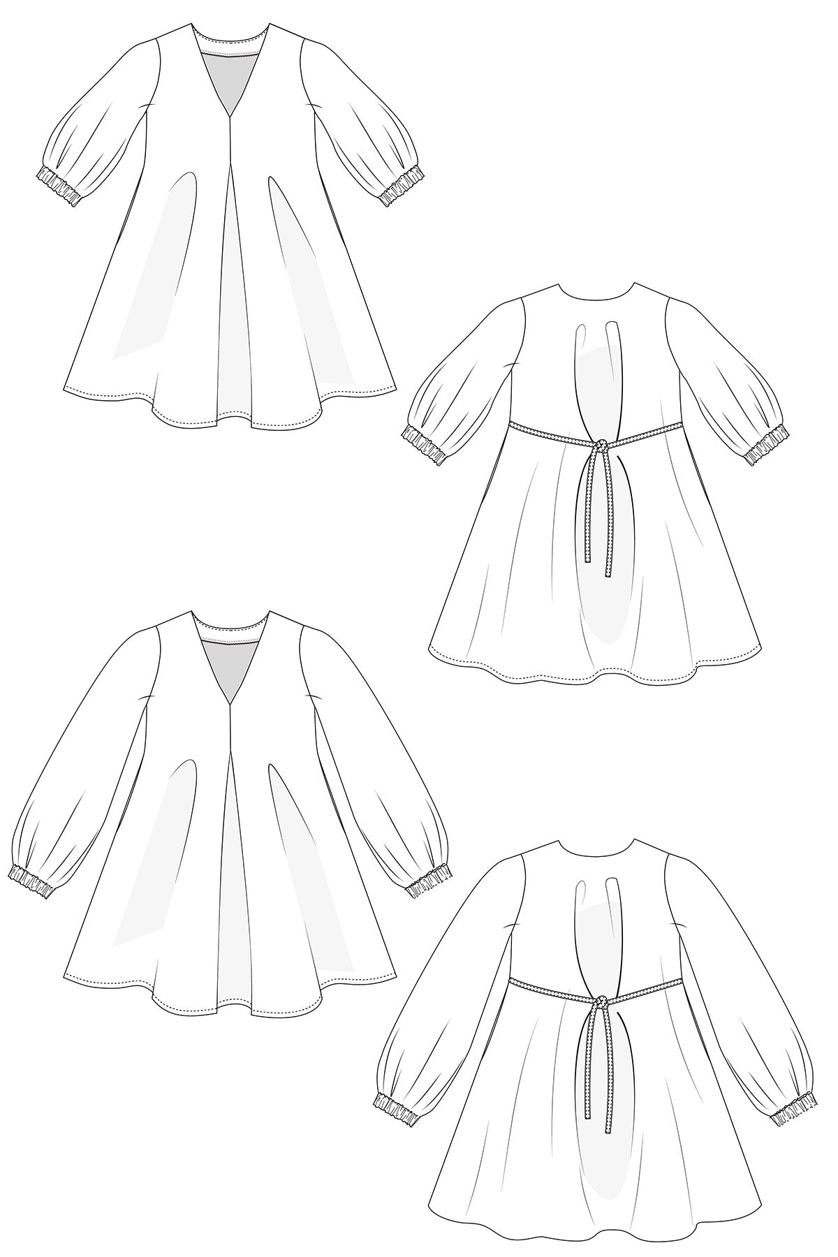 Hettie features a V-neckline and a big pleat at the centre front that creates shaping over the bust. Ties are sewn into the side seams under the bust to allow you to cinch everything in at the back for a more defined shape. The hem hits just above the knee and the pattern includes optional in-seam pockets.