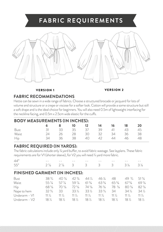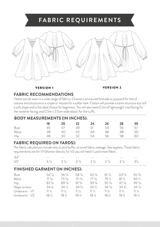 Pattern Sizes & Fabric Requirements