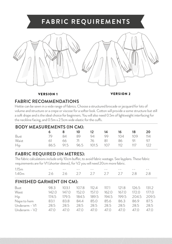 The Hettie Dress was made to really show off a special fabric and will work in most wovens: use a viscose or crepe for a softer look, choose a cotton for more structure or something extra special like a brocade or a woven velvet to make a real statement!