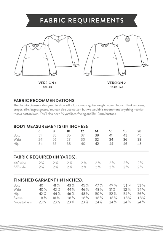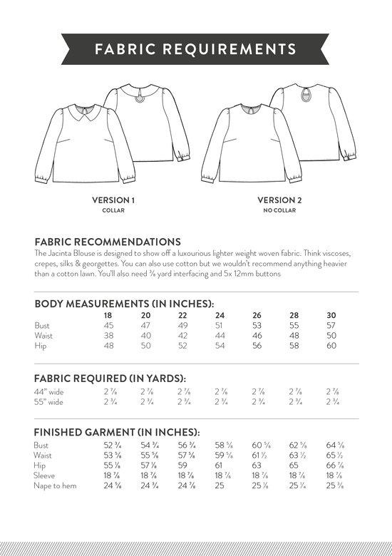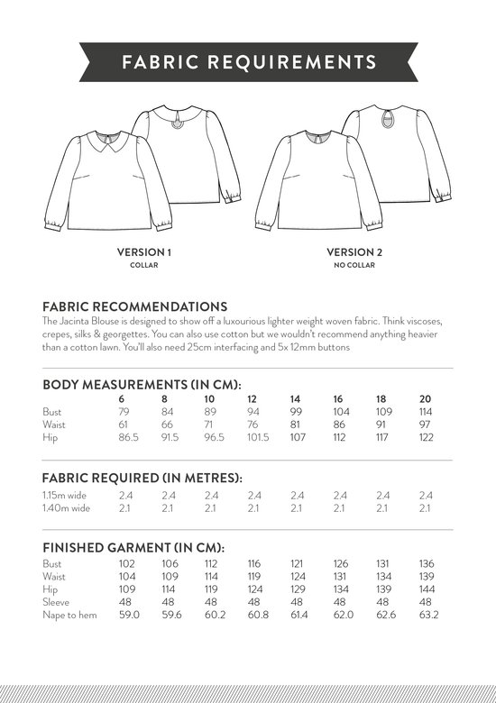 Jacinta is a timeless hip-length blouse featuring small bust darts, a gentle puff sleeve and deep cuffs finished with two buttons. Keep the elegant round neckline simple or add a pretty flat collar, which is split both at the front and the back. The neckline is enclosed in binding that goes all the way around a keyhole opening at the back, where the blouse closes with a thread loop and button.