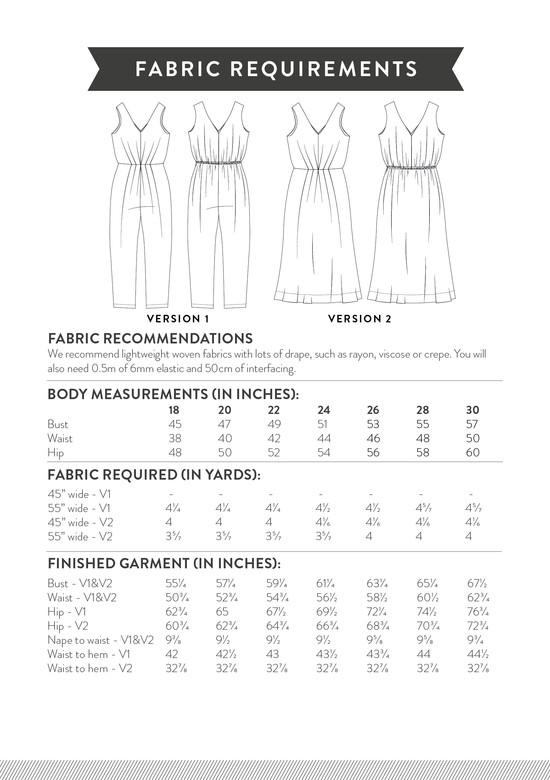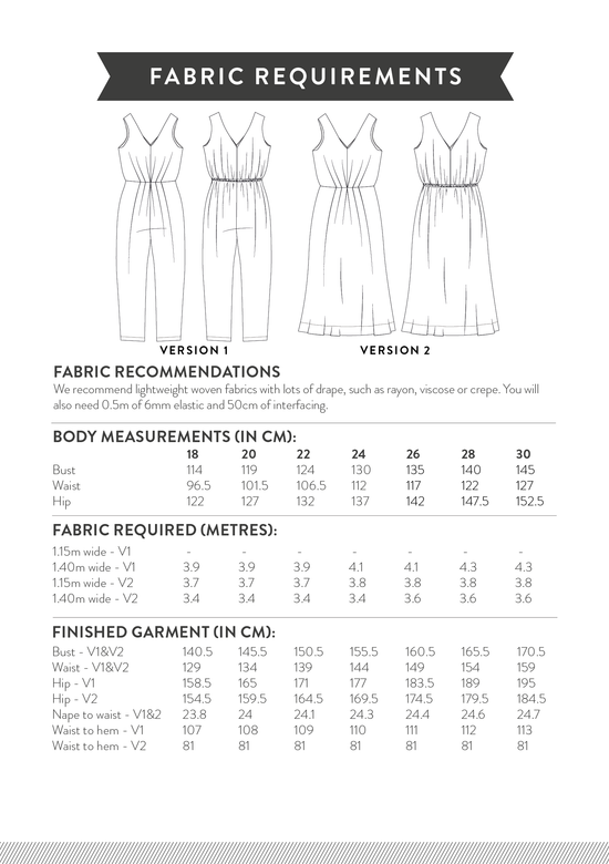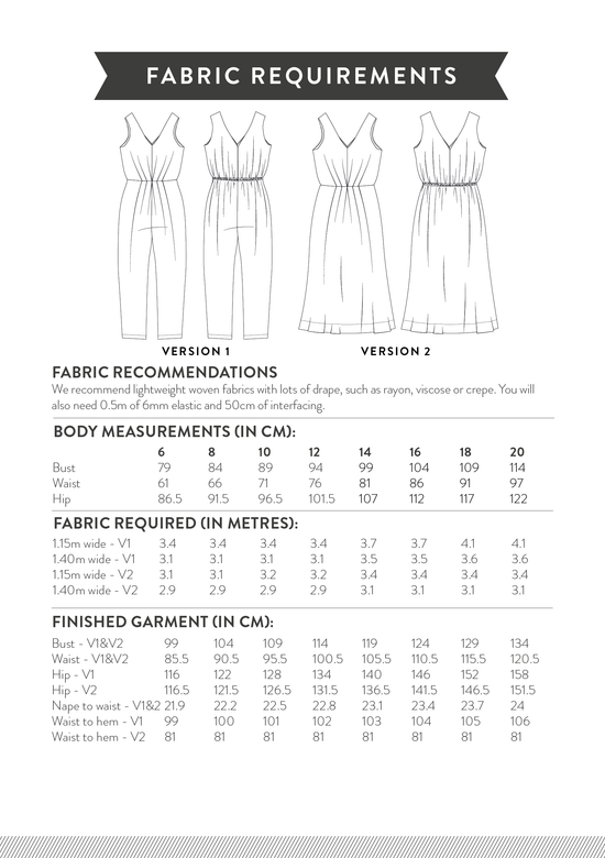 Jemima looks great in a solid colour to really show off the pleats, and she makes a beautiful print shine. A drapey viscose or crepe will work for both versions, and for the jumpsuit you could also use a slightly more structured fabric like viscose linen or chambray.