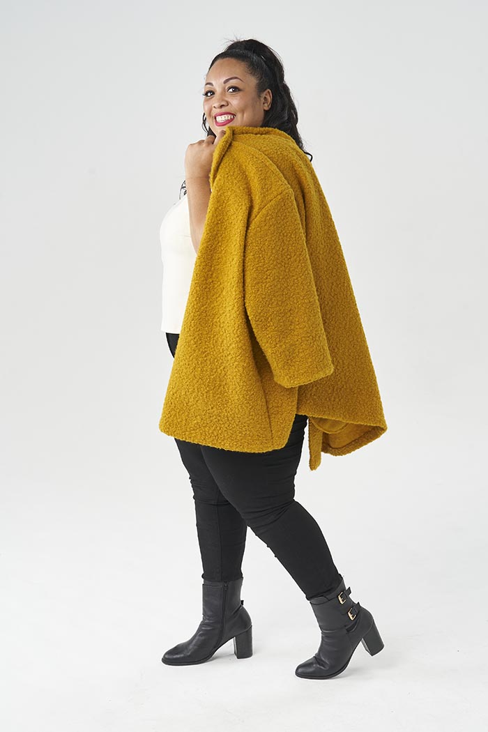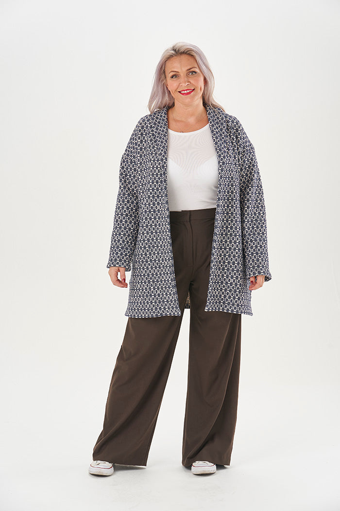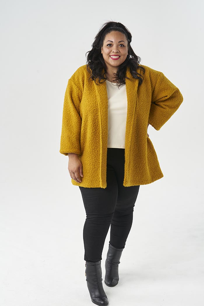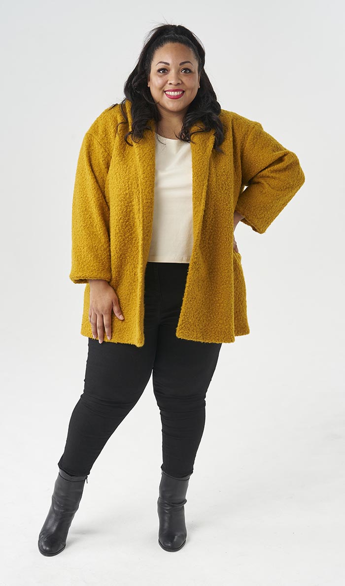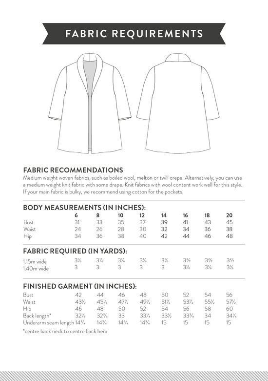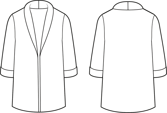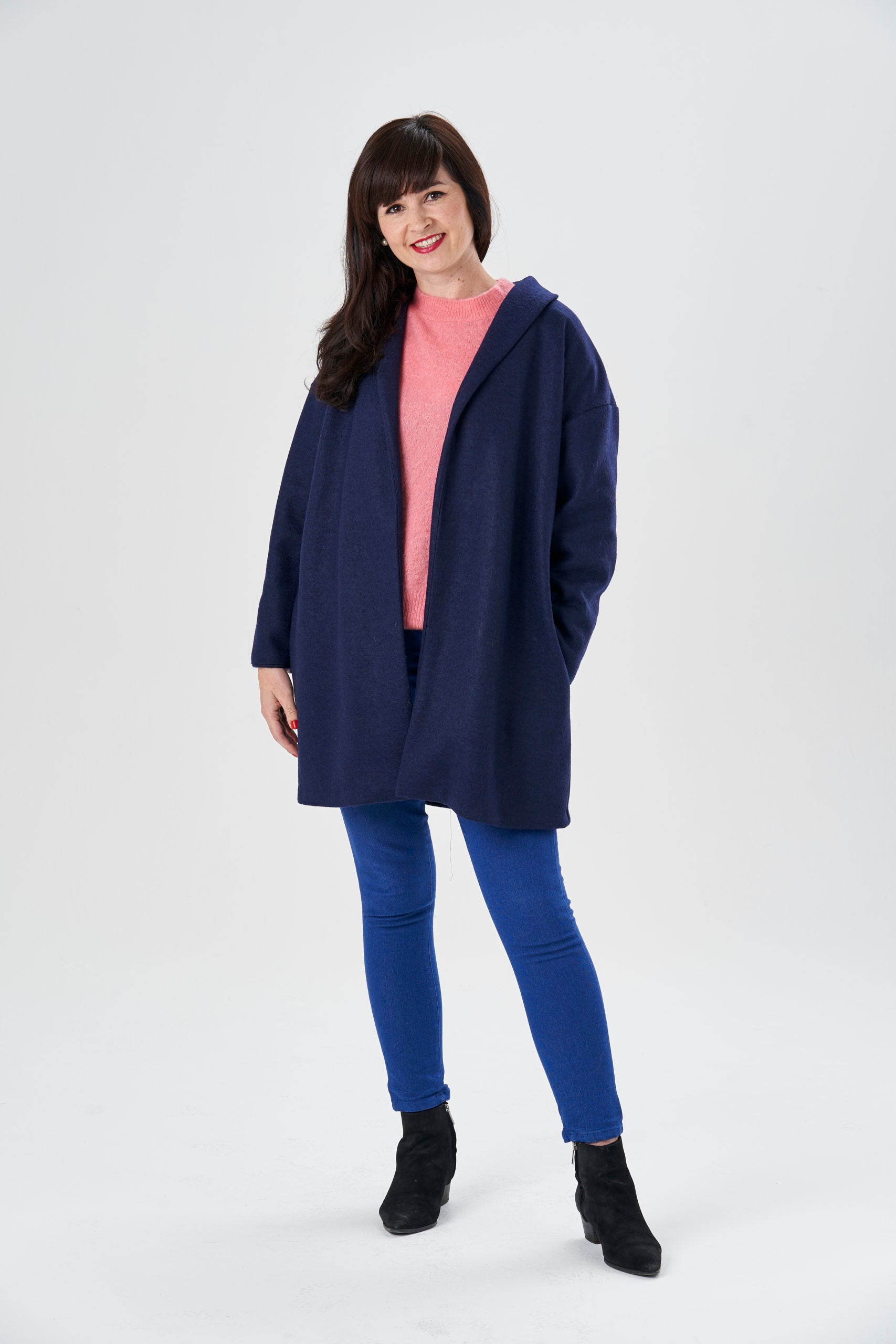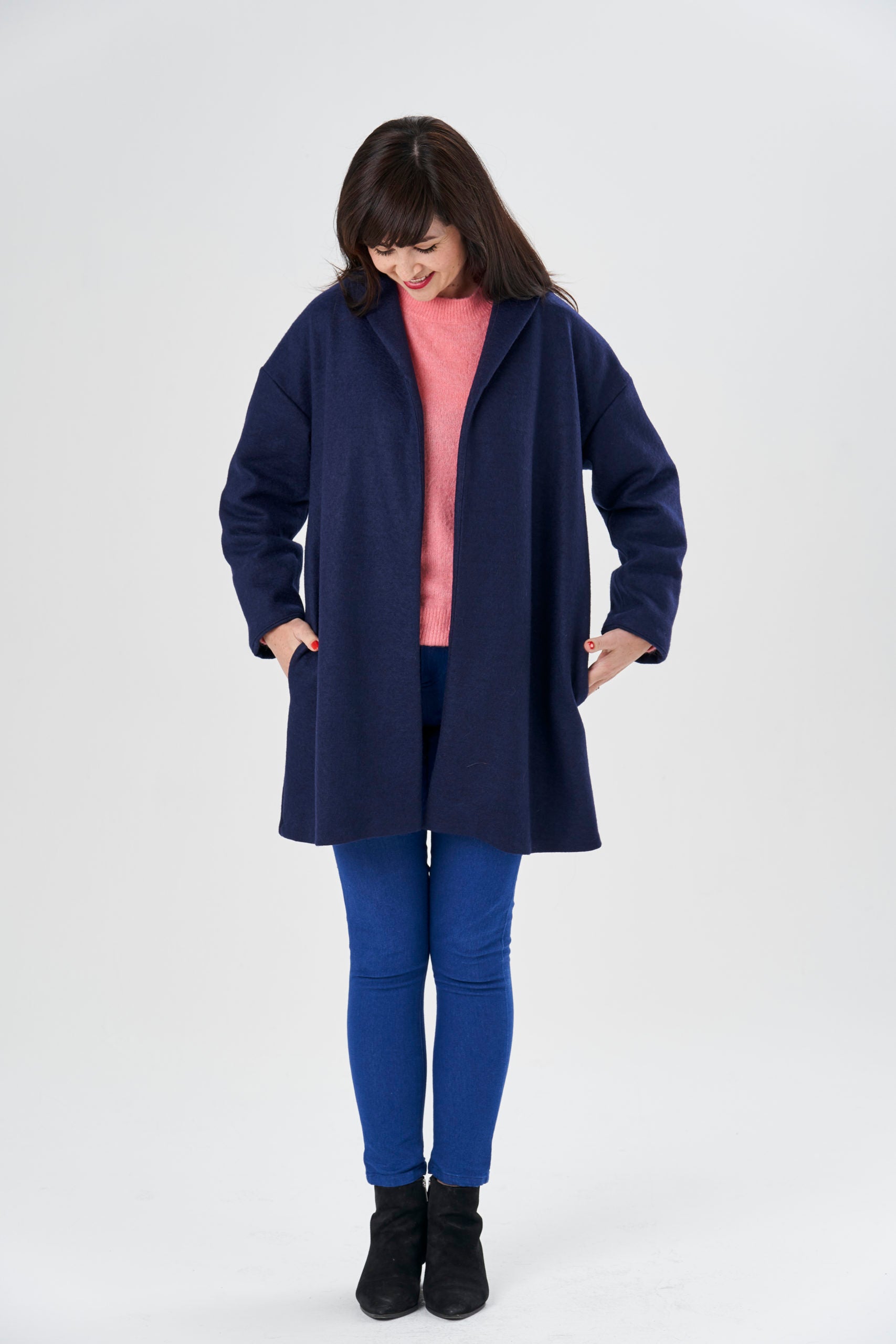 Jessie is an unlined swing-shape jacket with shawl collar, drop shoulder sleeves and nice deep pockets. The raw edges at the centre front are finished with a wide facing to keep the inside seams hidden. A nice quick make, the Jessie Coatigan has no closures, but can be wrapped closed and secured with a belt if you prefer. The hem of the coatigan hits mid-thigh while the sleeves can be folded up to bracelet length thanks to a deep facing, or left longer.