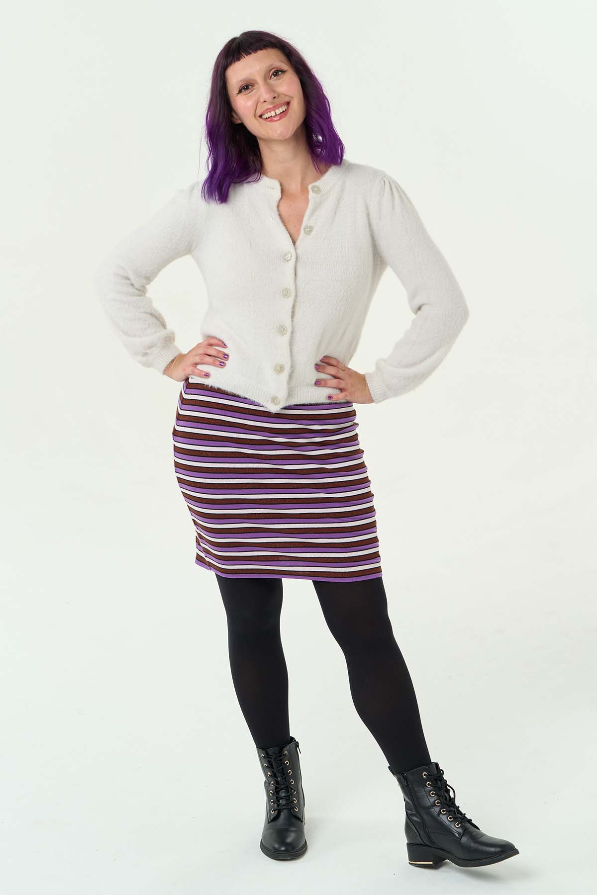 Lana is an easy-to-sew simple skirt designed for knit fabrics. She comes together really quickly and is a great piece to add to your wardrobe. Throw it on with tights, boots and a jumper for a perfect cosy outfit to take you through the colder months.