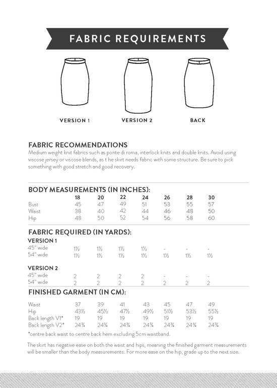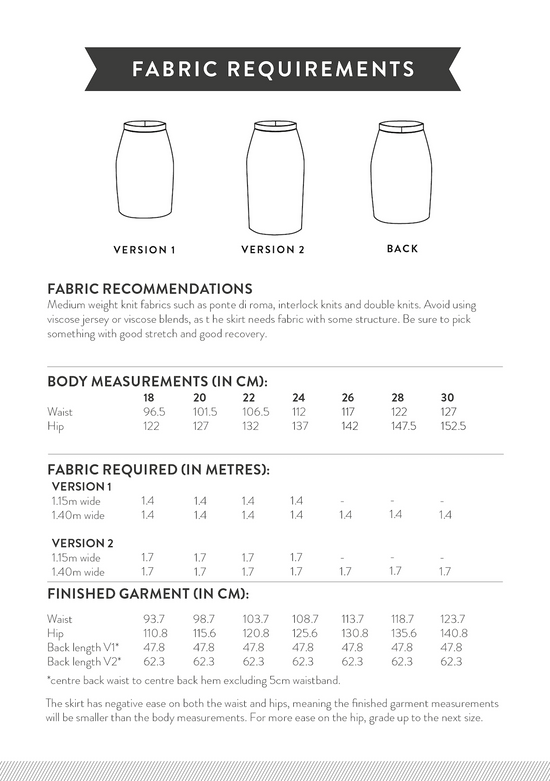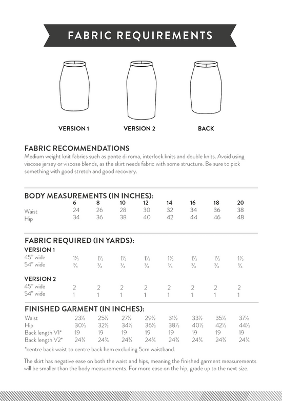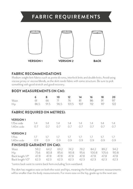 NB: If you previously bought the Sewalong Jersey Skirt you can use the ‘PDF Instruction Booklet Only’ option in the drop down menu to get the new Instruction Booklet, which includes layplans, size charts and fully illustrated step-by-step sewing instructions.