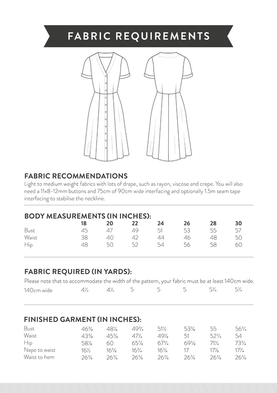 Lea is perfect for spring and summer, she is easy to wear and looks beautiful in a print (florals especially) and classic in a plain colour. Pick a fabric with plenty of drape, like a viscose or a crepe, to make the most of the swishy skirt.