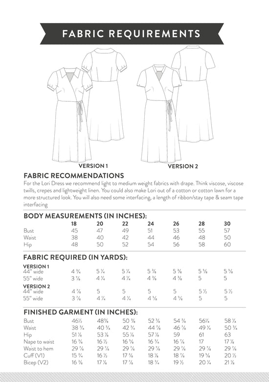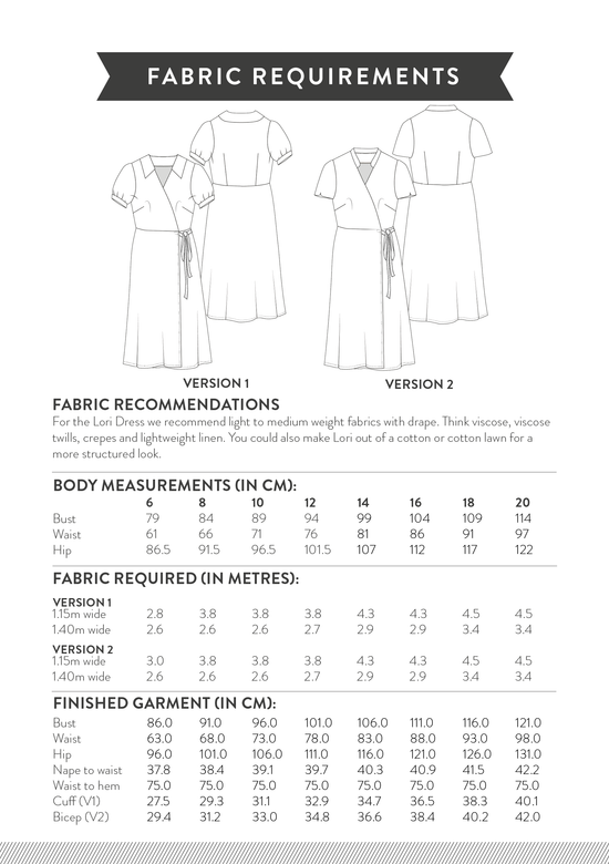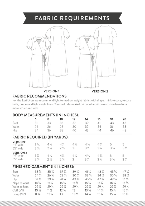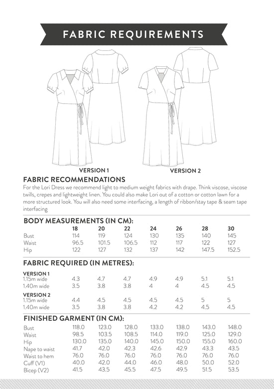 Fitted with bust darts on the front and waist darts on the back bodice, Lori features a beautiful silhouette with a generous wrap that is secured on the inside as well as on the outside with a pretty tie at the waist.