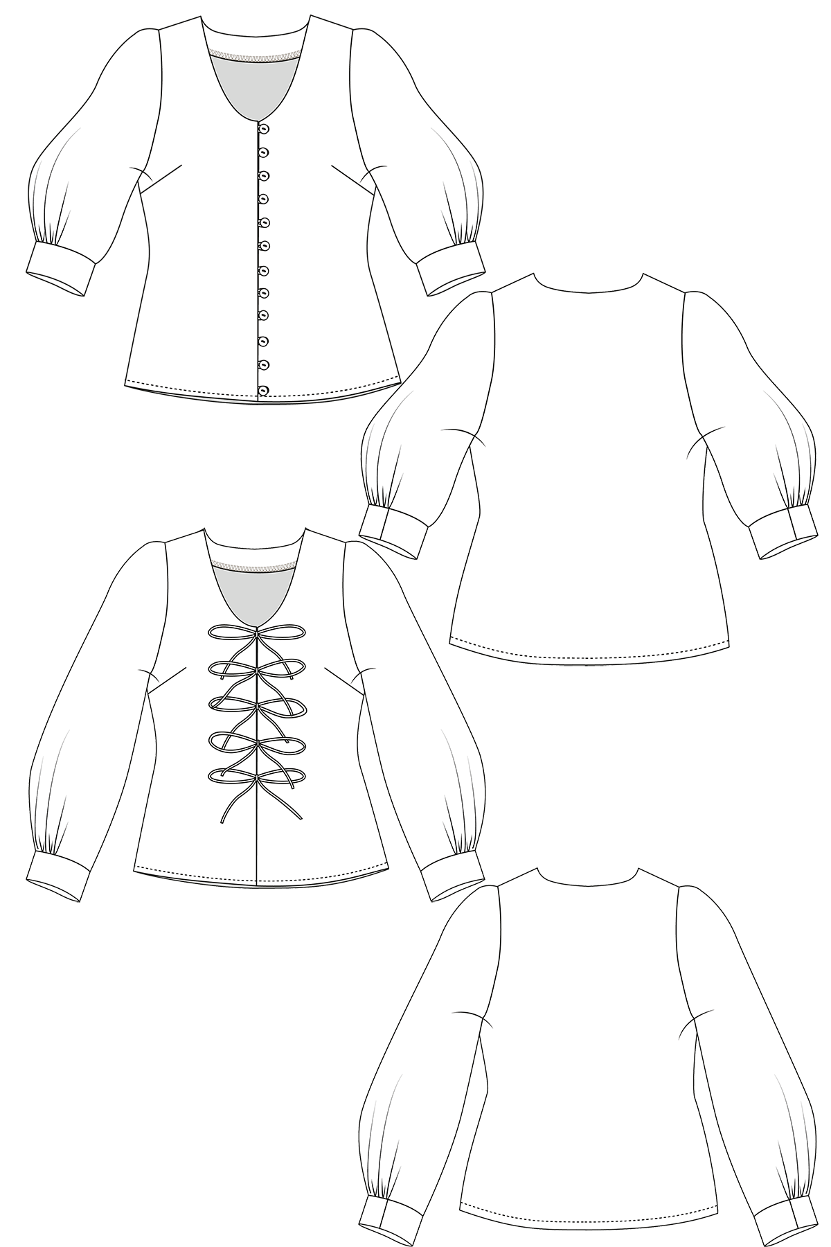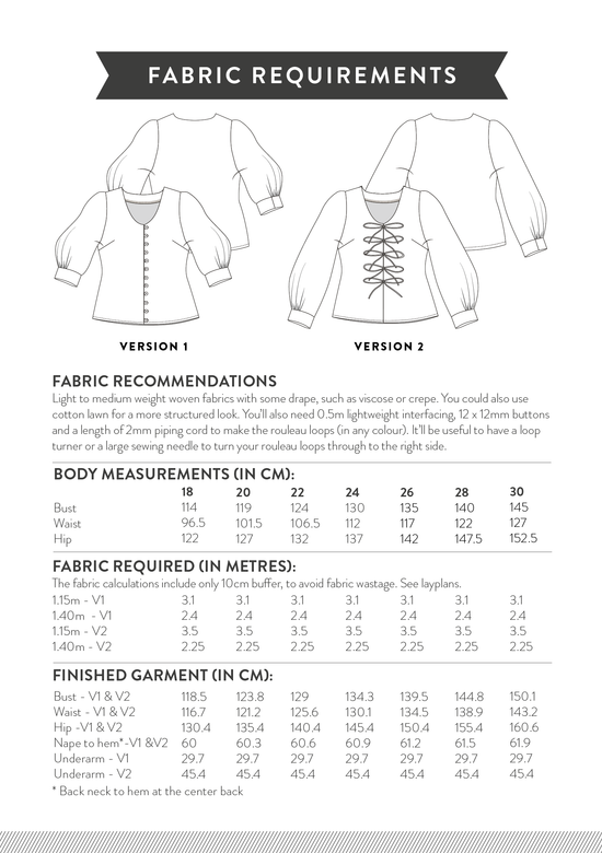 Version 1 features buttons all the way down the front with delicate rouleau loops instead of buttonholes. Version 2 closes with rouleau bow ties for an extra pretty touch. The Maeve bodice includes a button shield to provide full coverage whether you go buttons or bows!