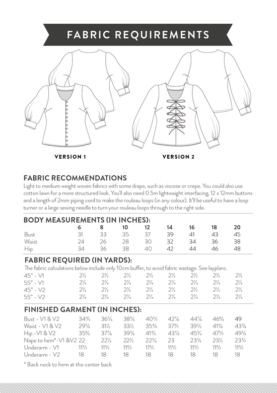 Pattern Sizes & Fabric Requirements
