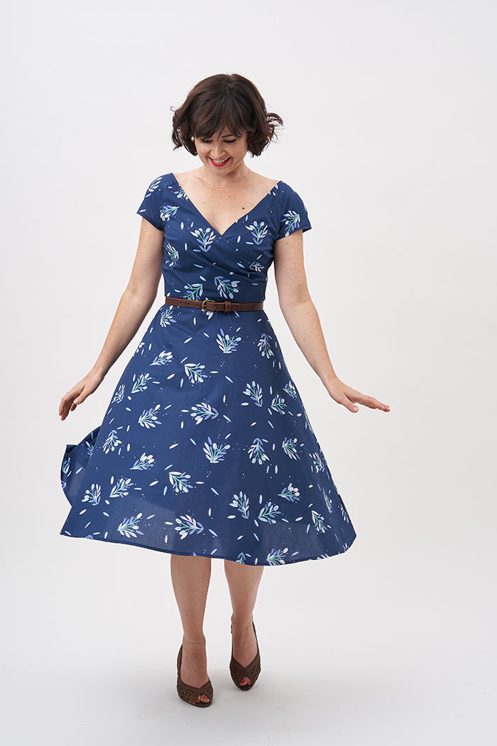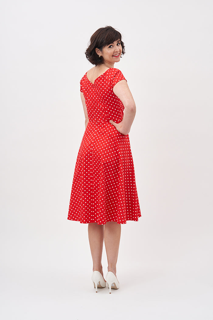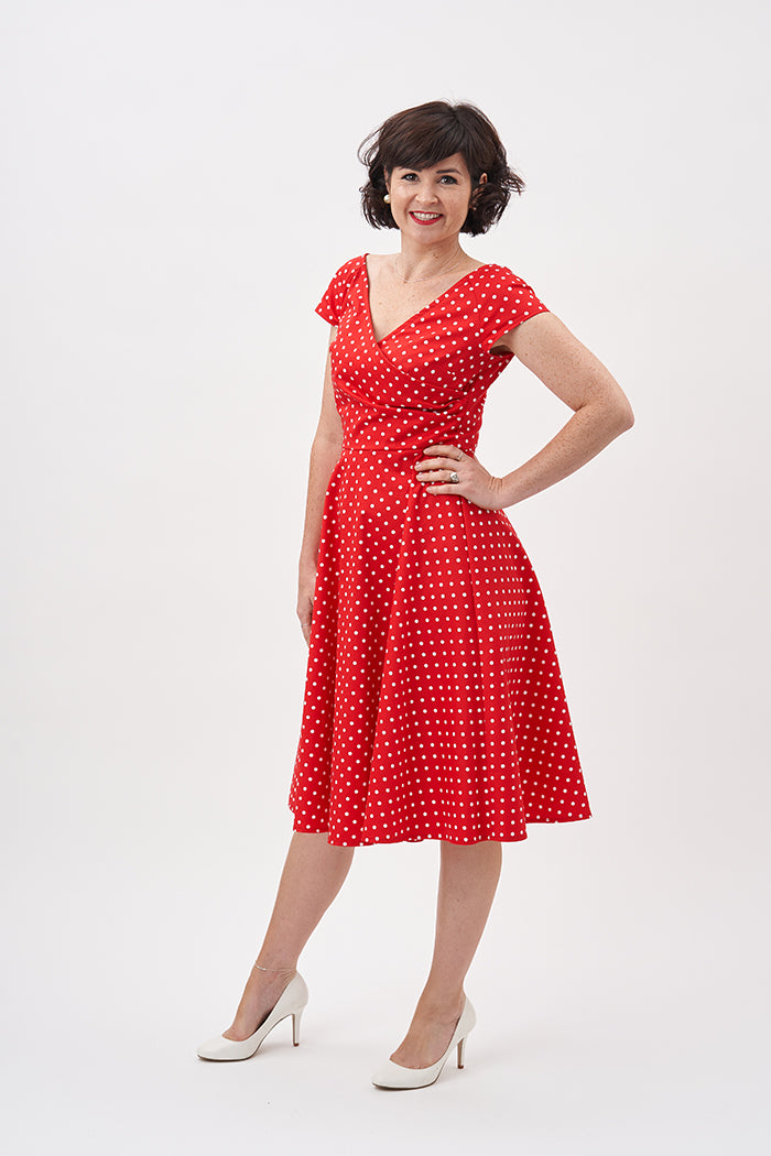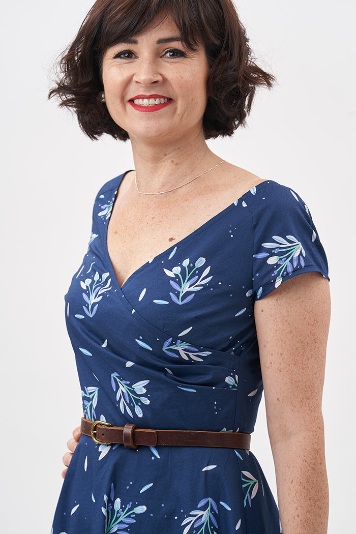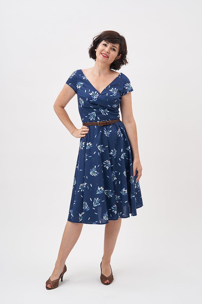 Fitted snuggly with darts, the bodice features a fixed wrap front, which pleats into the side seams. The raglan sleeves are shaped with darts over the shoulder for a fantastic fit. The back bodice mirrors the front with a bra-friendly v-shaped neckline. The bodice is fitted to the waist for that classic 50s’ look. The skirt is a half circle, skimming over the tummy and hips with no added bulk. It’s designed to finish just below the knee, but it can of course be lengthened or shortened to suit you. Maisie closes at the back with an invisible zip and the neckline is bias bound for a flawless finish.