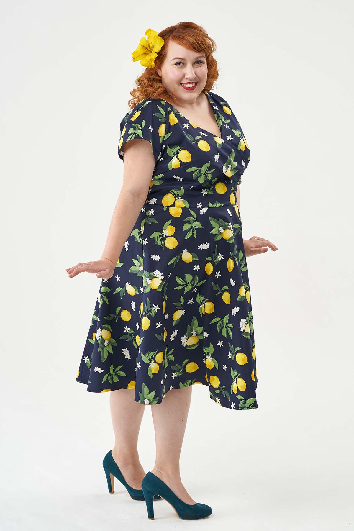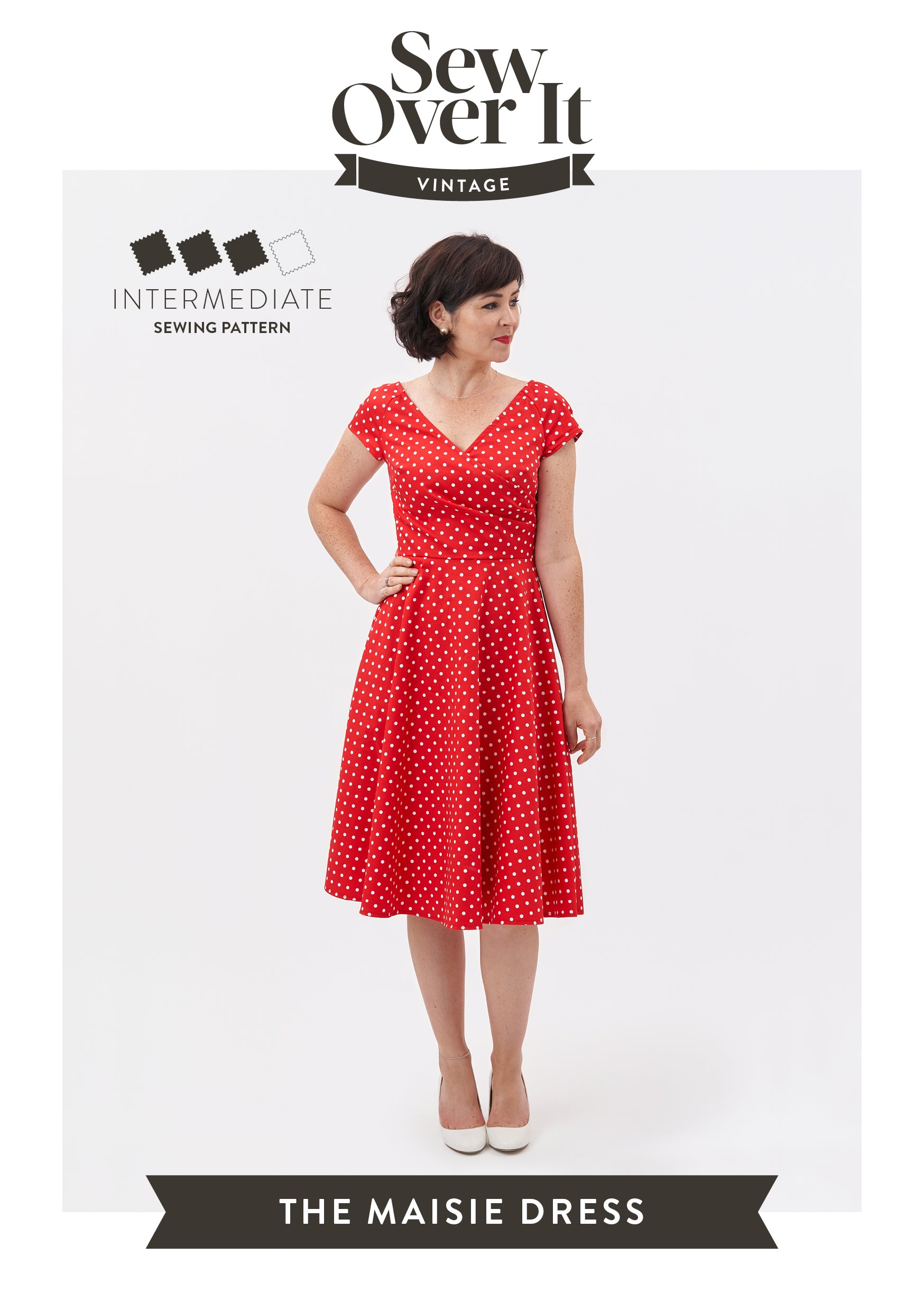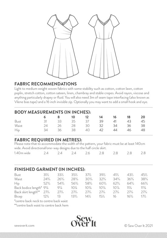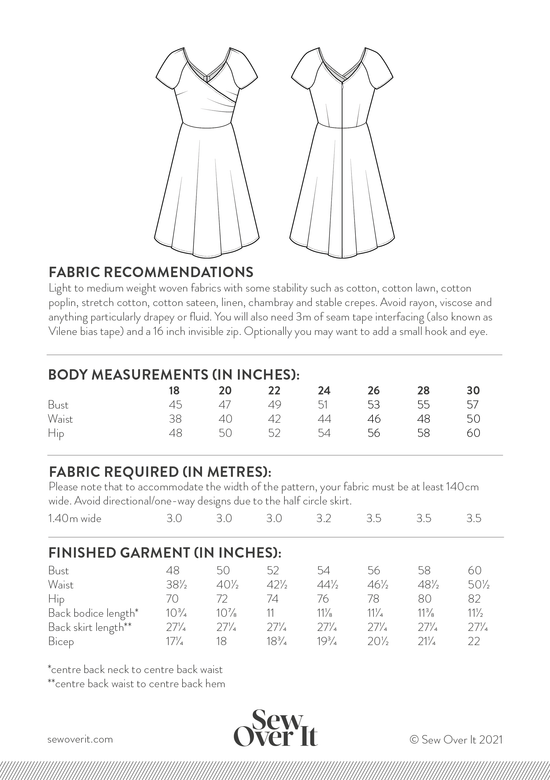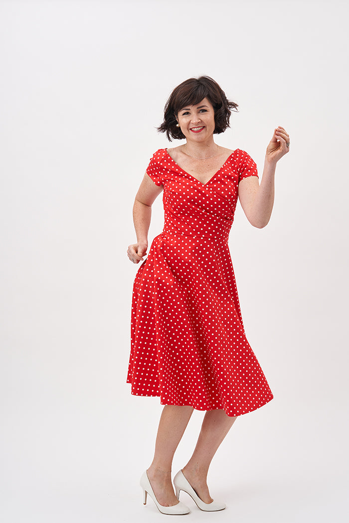 Fitted snuggly with darts, the bodice features a fixed wrap front, which pleats into the side seams. The raglan sleeves are shaped with darts over the shoulder for a fantastic fit. The back bodice mirrors the front with a bra-friendly v-shaped neckline. The bodice is fitted to the waist for that classic 50s’ look. The skirt is a half circle, skimming over the tummy and hips with no added bulk. It’s designed to finish just below the knee, but it can of course be lengthened or shortened to suit you. Maisie closes at the back with an invisible zip and the neckline is bias bound for a flawless finish.