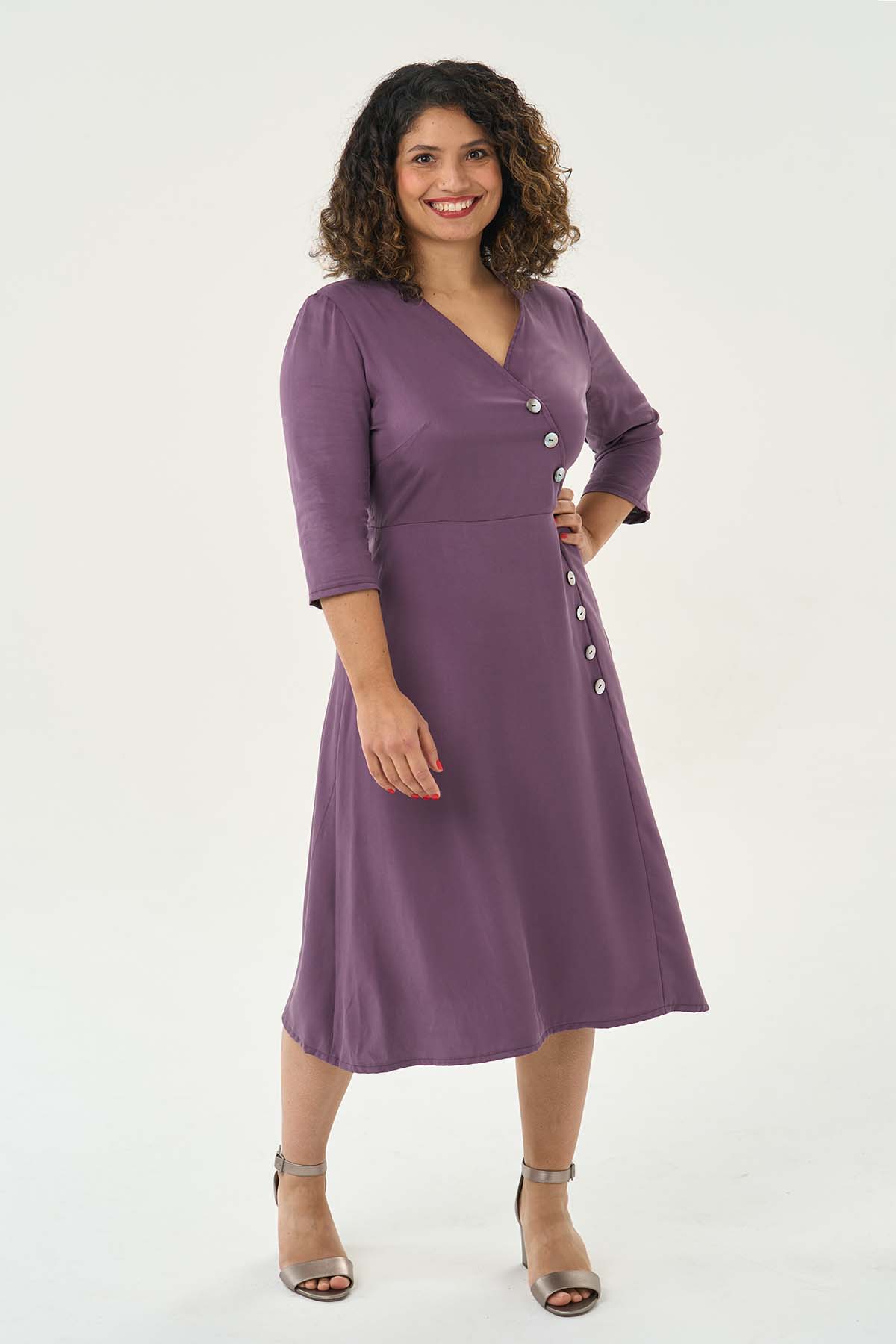 Shaping is provided by bust darts on the front bodice and waist darts on the back bodice, to create a beautiful fitted silhouette. The dress closes with an invisible zip on the side, and the neckline is finished neatly with binding.