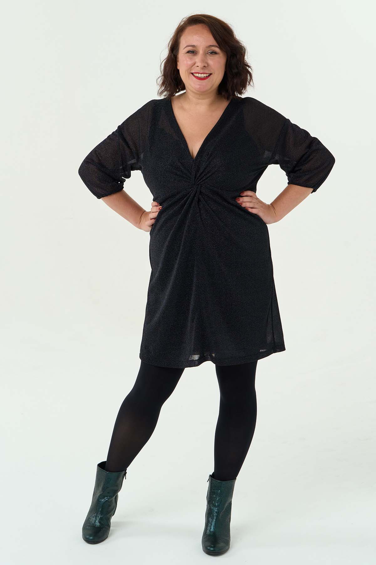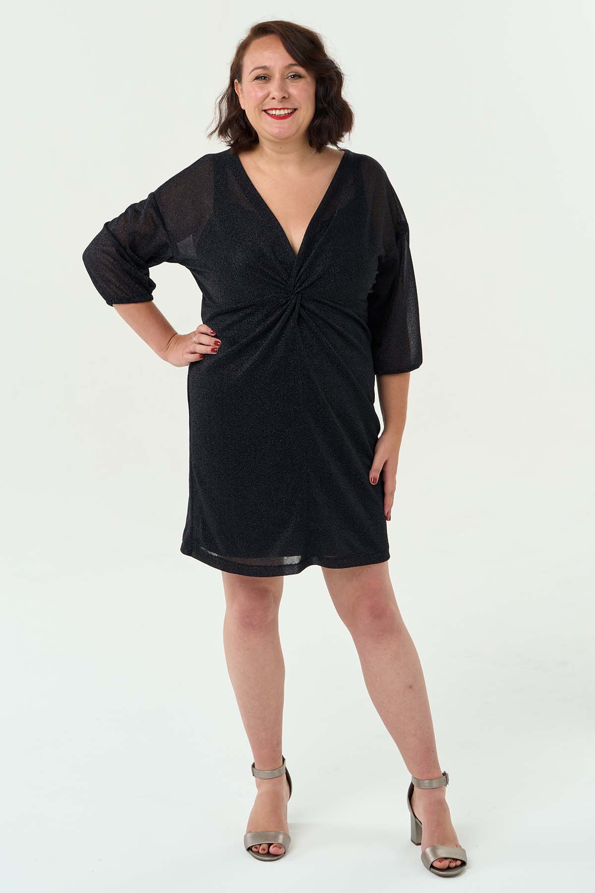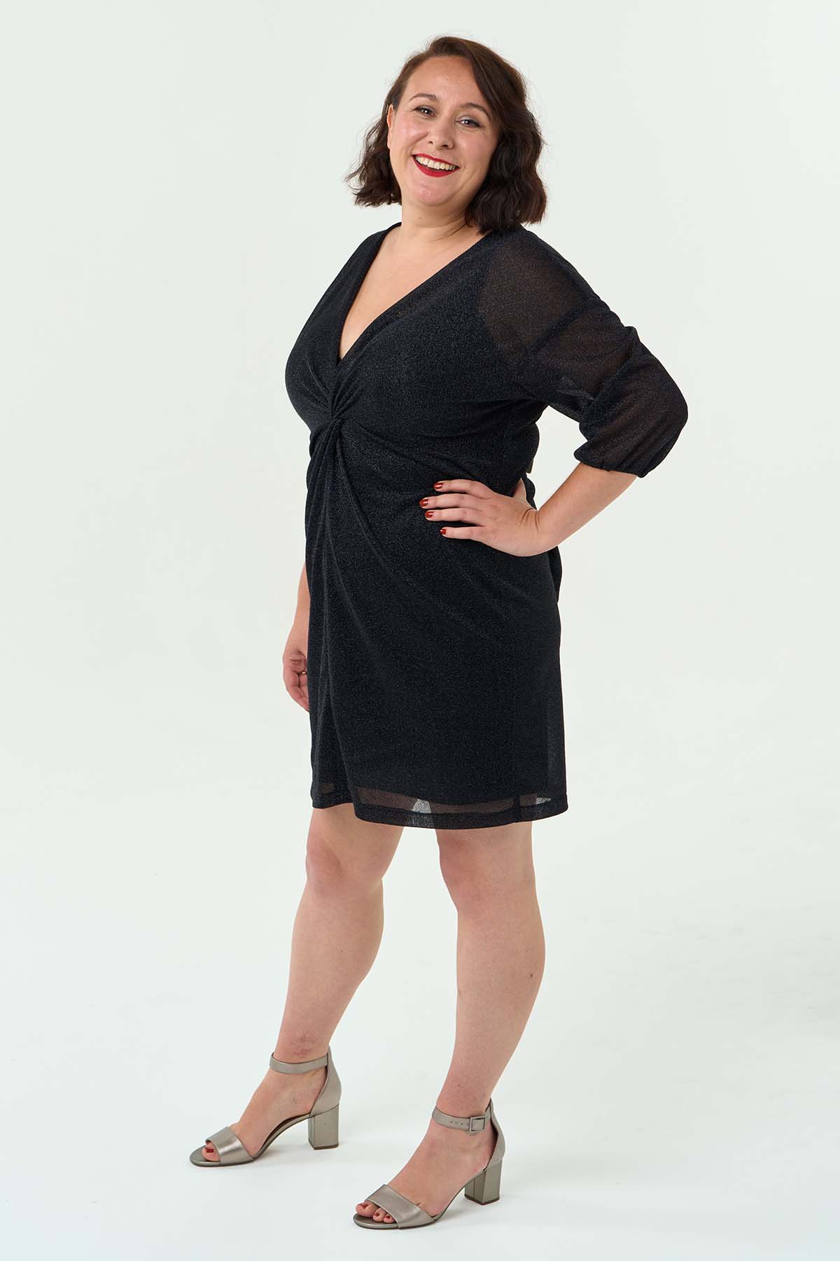 Pick between two lengths: just above or just below the knee. The shorter version makes a great party dress, especially if you make your Portia Dress in a sparkly jersey like Rosie’s black glitter version (worn over a slip).