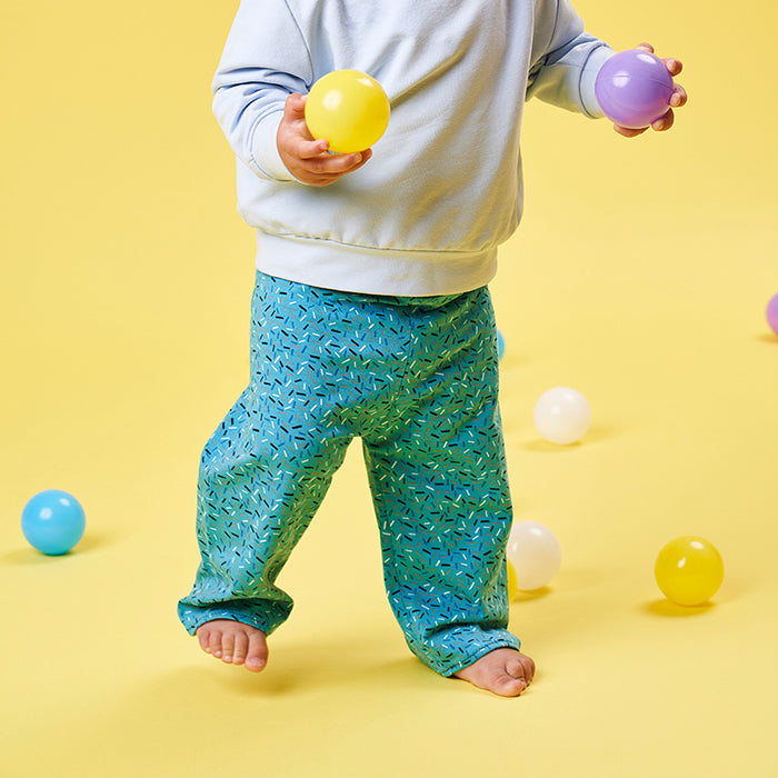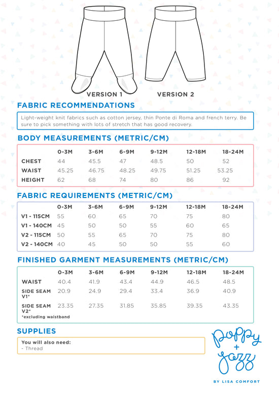 The Tangerine Trousers are a pair of easy-to-wear, everyday leggings. When Jasmine was very little all her shop-bought trousers had narrow waistbands which dug into her tummy, so when Lisa designed the Tangerine Trousers she knew she wanted them to have a nice wide, comfy waistband. They can be worn open at the ankle but also come with the option to add feet, which means no more lost socks!