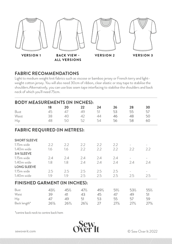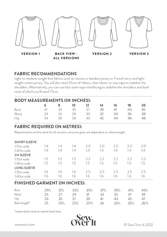 With three different necklines and sleeve lengths to choose from, you can make up to 9 different versions of this pattern! We think it will be a great one to hack and combine with other patterns too. Choose between a crew, scoop or V neck and make the sleeves short, 3/4, or full length.