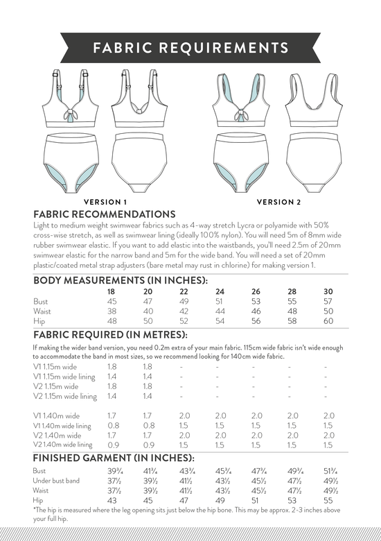 If you choose the PDF + A0 printed pattern options above, you will receive a print of all versions of the Zahra pattern. If you’d like to order a print of just the Zahra Swimsuit or just the Zahra Bikini on A0 paper, head over to our Copyshop page for more options.